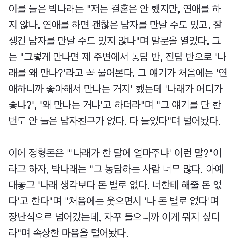 [스크랩] [기타]박나래 "지인들, 전남친에 '나래가 한달에 얼마줘?' 무례한 질문도" ('금쪽상담소') 작성자스냅랙|작성시간25.12.09|조회수49,400 목록 댓글 74 글자크기 작게가 글자크기 크게가 https://naver.me/Ga2R9nCo박나래 "지인들, 전남친에 '나래가 한달에 얼마줘?' 무례한 질문도" ('금쪽상담소')방송인 박나래가 연애 관련 주변인들의 무례한 질문에 속상함을 털어놨다. 지난 30 방송된 채널A '오은영의 금쪽 상담소'에서는댄서 팝핀현준, 국악인 박애리 부부의 고민이 공개됐다. 이날 결혼n.news.naver.com 다음검색 스크랩 원문 : 쭉빵카페 현재 게시글 추가 기능 열기 북마크 공유하기 신고 센터로 신고 댓글 댓글 74 댓글쓰기 답글쓰기 댓글 리스트 작성자뭐랑 | 작성시간 25.12.10 남미새 끝판왕… 작성자매뚜기 | 작성시간 25.12.10 하아..여자 망신 다시키는구나돈까지 주면서 남자를 왜만나냐 작성자헤이하이버이중 | 작성시간 25.12.10 걱정해서 해 준 말이엇네 작성자강쥐만이 살길 | 작성시간 25.12.10 주니깐...그리고 돈보고 만나는 남자들 같으니깐 작성자소여야 | 작성시간 25.12.10 나혼산에서도 맨날 퍼주는 연애 한다더니 진짜였네 댓글 전체보기
