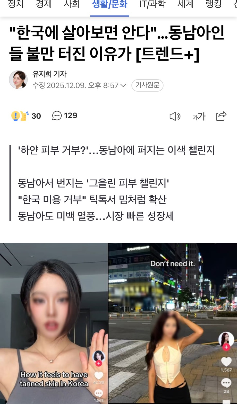 한국의 '하얀 피부' 를 정면으로 겨냥한 이른바 '그을린 피부(tanned skin) 챌린지'가 동남아시아를 중심으로 빠르게 확산하고 있다. 이들은 '하얀 피부'를 한국식 미적 기준으로 규정하며 이에 반발하는 콘텐츠를 잇따라 제작하고 있다.