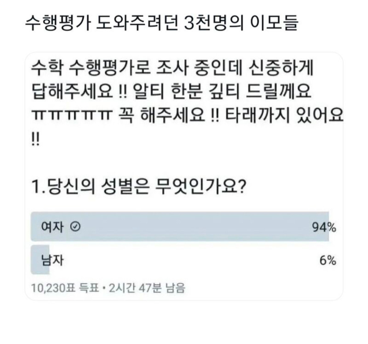 [스크랩] [흥미돋]수행평가 도와주려던 3천명의 이모들 작성자flflf|작성시간25.12.10|조회수56,544 목록 댓글 56 글자크기 작게가 글자크기 크게가 다음검색 스크랩 원문 : 도탁스 (DOTAX) 현재 게시글 추가 기능 열기 북마크 공유하기 신고 센터로 신고 댓글 댓글 56 댓글쓰기 답글쓰기 댓글 리스트 작성자퍽 퍽 | 작성시간 25.12.10 아니 00도 안넣어주네 ㅋㅋㅋㅋㅋㅋㅋ 작성자그여름밤 | 작성시간 25.12.10 늙은이는안된다? 작성자달의 그림자 아래 선 나 | 작성시간 25.12.10 학번은 안되는지요? 작성자회피형죽이는방법 | 작성시간 25.12.10 너무하네 작성자뚤기뚤 | 작성시간 25.12.10 개웃겨시바 ㅜㅠㅋㄱㅋㄱㅋㄱㅋㄱㅋㄱㅋㄱ 댓글 전체보기