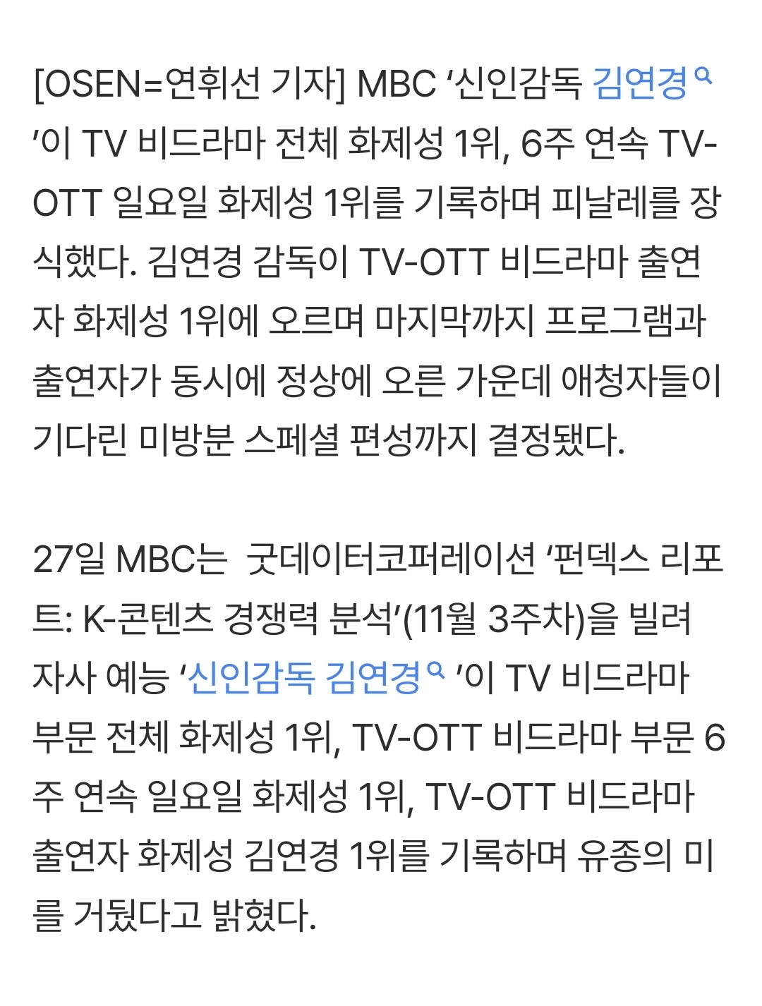 [여시뉴스데스크]김연경, 연예대상까지 탈 기세...'신인감독 김연경' 종영까지 화제성 1위 싹쓸이 [공식] 작성자생각하고댓글달기|작성시간25.12.10|조회수4,468 목록 댓글 66 글자크기 작게가 글자크기 크게가 출처: https://naver.me/GYGa3iyX김연경, 연예대상까지 탈 기세...'신인감독 김연경' 종영까지 화제성 1위 싹쓸이 [공식]여기를 눌러 링크를 확인하세요m.entertain.naver.com연경신 대상드려 시즌2 낋여 다음검색 현재 게시글 추가 기능 열기 북마크 공유하기 신고 센터로 신고 댓글 댓글 66 댓글쓰기 답글쓰기 댓글 리스트 작성자멍뭉이왈츠 | 작성시간 25.12.10 드려 작성자길로간 | 작성시간 25.12.10 이름새겨놔.. 작성자수목일 | 작성시간 25.12.10 당연 작성자지니지니에 | 작성시간 25.12.11 대상드려 작성자사등급힘차게퇴장 | 작성시간 25.12.11 걍 대존잼 빨리 더줘 댓글 전체보기