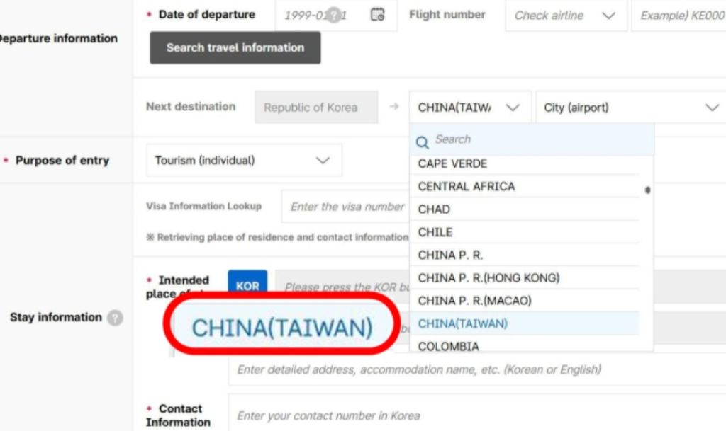 출발지/목적지 선택란에 '중국(대만)' 표기