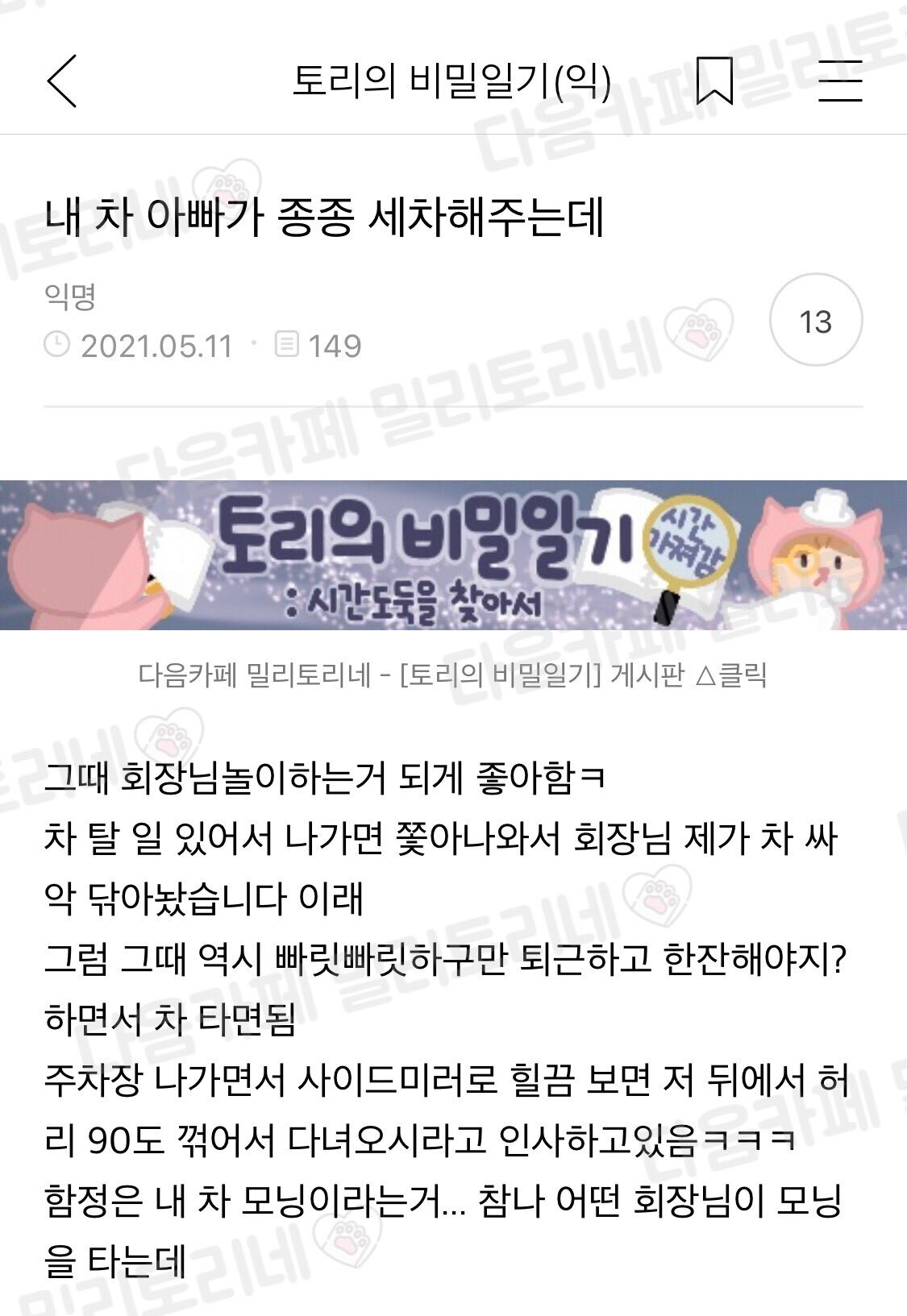 [흥미돋]내 차 아빠가 종종 세차해주는데 작성자엿시씌|작성시간25.12.10|조회수85,628 목록 댓글 45 글자크기 작게가 글자크기 크게가 출처: https://m.cafe.daum.net/baemilytory/91cd/317388?svc=cafeapp 다음검색 현재 게시글 추가 기능 열기 북마크 공유하기 신고 센터로 신고 댓글 댓글 45 댓글쓰기 답글쓰기 댓글 리스트 작성자홍김동 | 작성시간 25.12.10 귀여워 화목한 가정 ㅋㅋㅋㅋㅋ 작성자정지안 | 작성시간 25.12.10 귀엽다ㅋㅋ 재밌게 사네 작성자거짓말은하지마요 | 작성시간 25.12.10 재밌게 사네 ㅋㅋㅋㅋㅋㅋㅋ 작성자Amoroso | 작성시간 25.12.10 아 진짜 귀엽고 재밌다ㅋㅋㅋㅋㅋㅋ 작성자노으을 | 작성시간 25.12.20 ㅋㅋㅋㅋㅋㅋㅋㅋㅋㅋㅋㅋㅋㅋㅋ 아빠 졸귀 댓글 전체보기