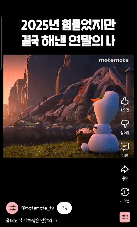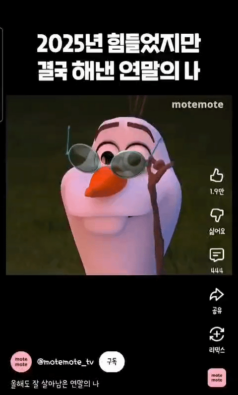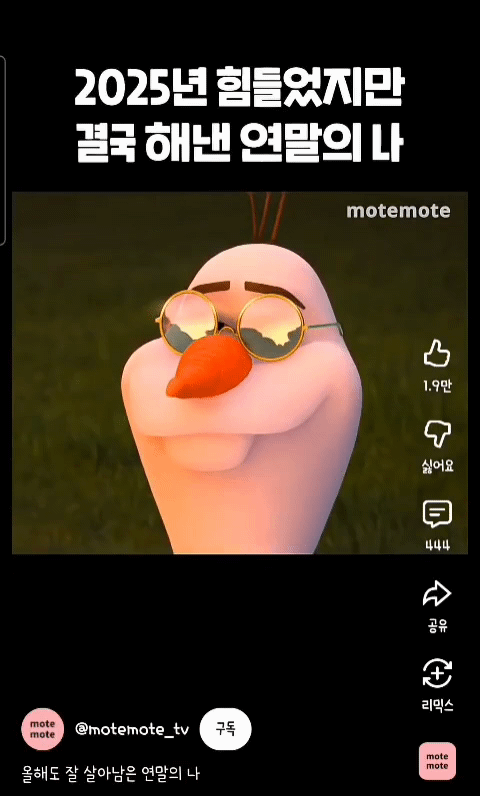 [흥미돋]2025년 힘들었지만 결국 해낸 연말의 나 작성자안녕하세요백수입니다|작성시간25.12.10|조회수4,881 목록 댓글 8 글자크기 작게가 글자크기 크게가 출처: 여성시대 안녕하세요백수입니다https://youtube.com/shorts/Sj5UgZ9dwD4?si=27kEKAuxGvgNUFre올 한해도 고생 많았어 다음검색 현재 게시글 추가 기능 열기 북마크 공유하기 신고 센터로 신고 댓글 댓글 8 댓글쓰기 답글쓰기 댓글 리스트 작성자러키더블링 | 작성시간 25.12.10 왜 올라프냐고 하지만 수고했다 나 작성자을을엉! | 작성시간 25.12.10 건강하게 여시들이랑 1년 또 보냈으니 성공~! 작성자냘링닝 | 작성시간 25.12.10 올해 작년계엄부터 대선까지 시위나가느라 너무고생했음ㅠ 작성자그해겨울은따뜻했네 | 작성시간 25.12.10 올라프는 나뭇가지 팔인데 어떻게 박수를 칠까 궁금하지만.. 그래도 올해 나 참 수고했다!! 웰던ㅎㅎ 작성자얼아이니드이쥬 | 작성시간 25.12.10 상위 고과 받은 나 칭찬해 댓글 전체보기
