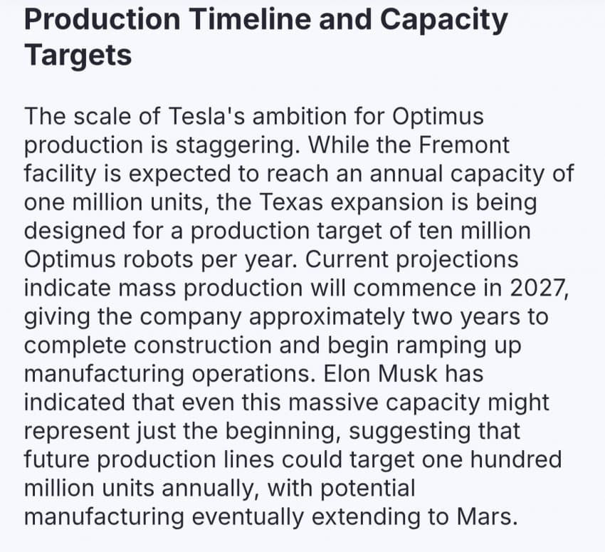 해당 텍사스 공장은 2027년에 가동 시작 예정이고, 점차 생산량을 늘려 최종적으로 연간 1,000만대의 옵티머스 로봇을 생산할 예정이라고함.