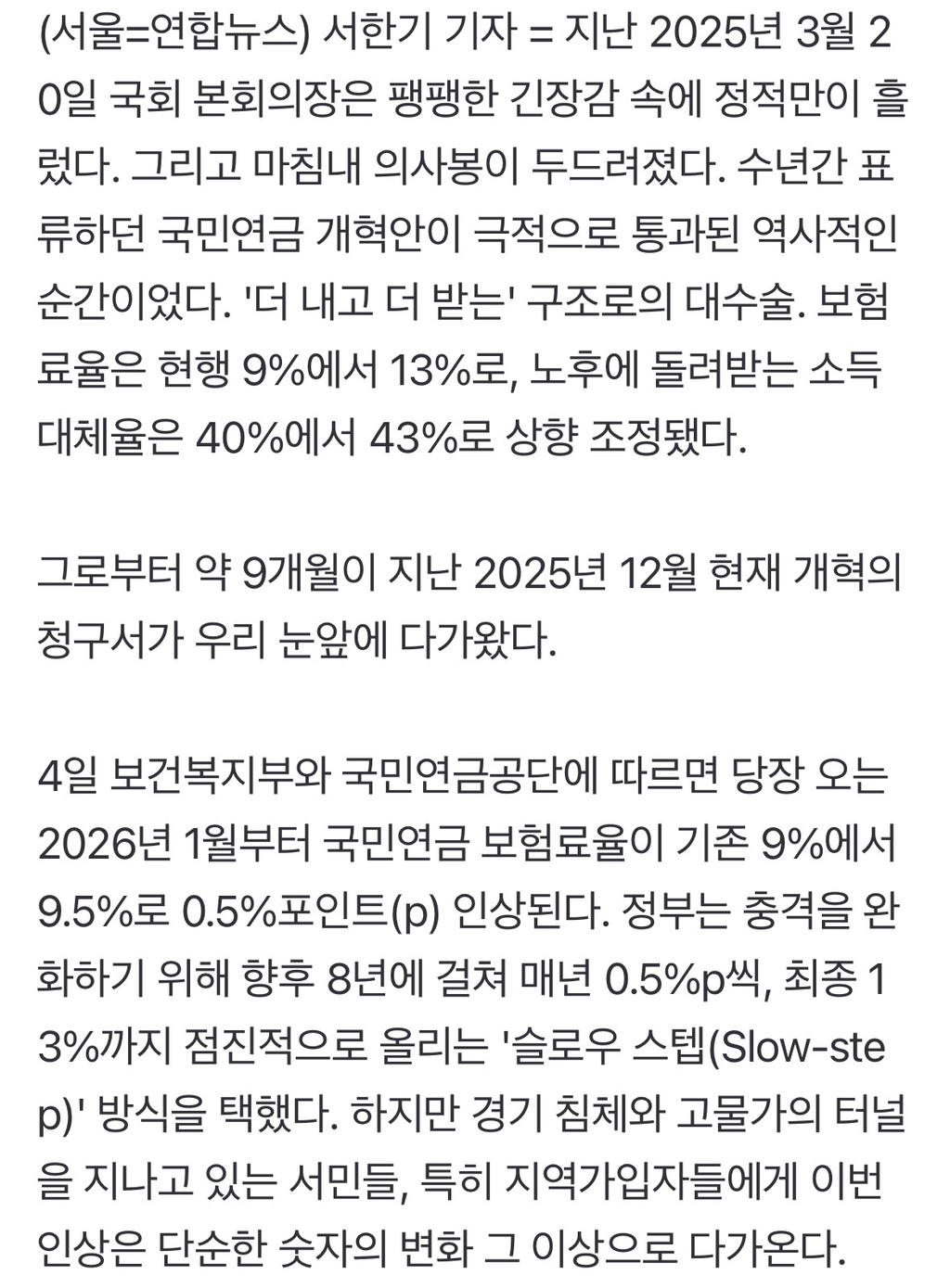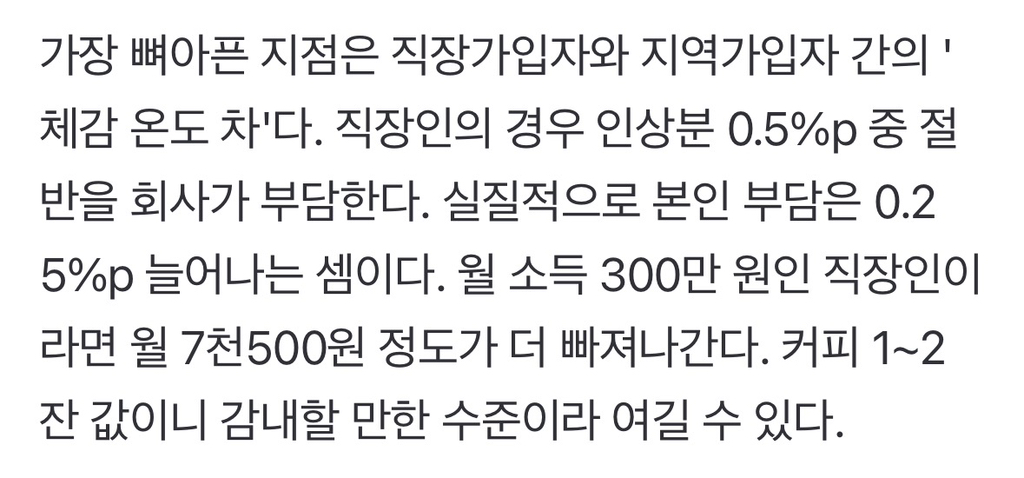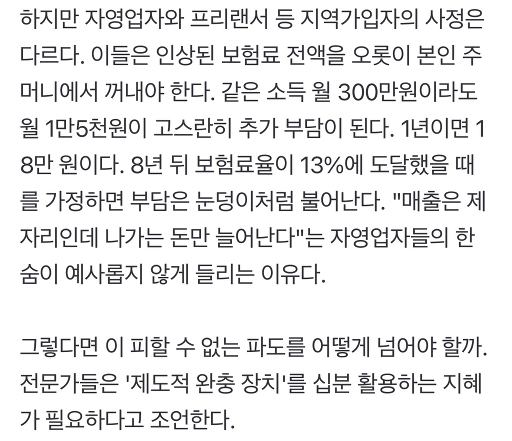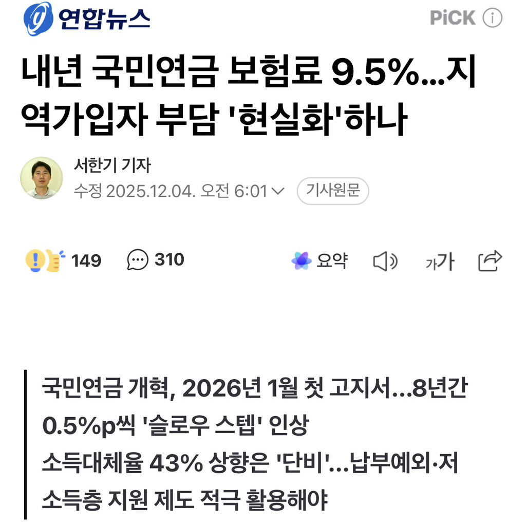 [기타]내년 국민연금 보험료 9.5%…지역가입자 부담 '현실화'하나 작성자이런건방진|작성시간25.12.10|조회수8,787 목록 댓글 4 글자크기 작게가 글자크기 크게가 출처: https://n.news.naver.com/article/001/0015777654?sid=102내년 국민연금 보험료 9.5%…지역가입자 부담 '현실화'하나국민연금 개혁, 2026년 1월 첫 고지서…8년간 0.5%p씩 '슬로우 스텝' 인상 소득대체율 43% 상향은 '단비'…납부예외·저소득층 지원 제도 적극 활용해야 지난 2025년 3월 20일 국회 본회의장은 팽팽한 n.news.naver.com 다음검색 현재 게시글 추가 기능 열기 북마크 공유하기 신고 센터로 신고 댓글 댓글 4 댓글쓰기 답글쓰기 댓글 리스트 작성자쟝포니 | 작성시간 25.12.10 진짜 지역가입자는 너무 부담스러워 작성자메일초코우유 | 작성시간 25.12.10 나 깜짝놀랐어.진짜..ㅜㅜㅜ 경기도 안좋아서 장사도 안된다고요.. 작성자낼은 햄버거 먹어야지 | 작성시간 25.12.10 이래서 어떻게든 회사 들어갈라고.. 작성자퐁당퐁당 또 Fallin | 작성시간 25.12.10 아...어떡하지...ㅋㅋㅋㅋㅋㅋ 못내요..그거... 댓글 전체보기