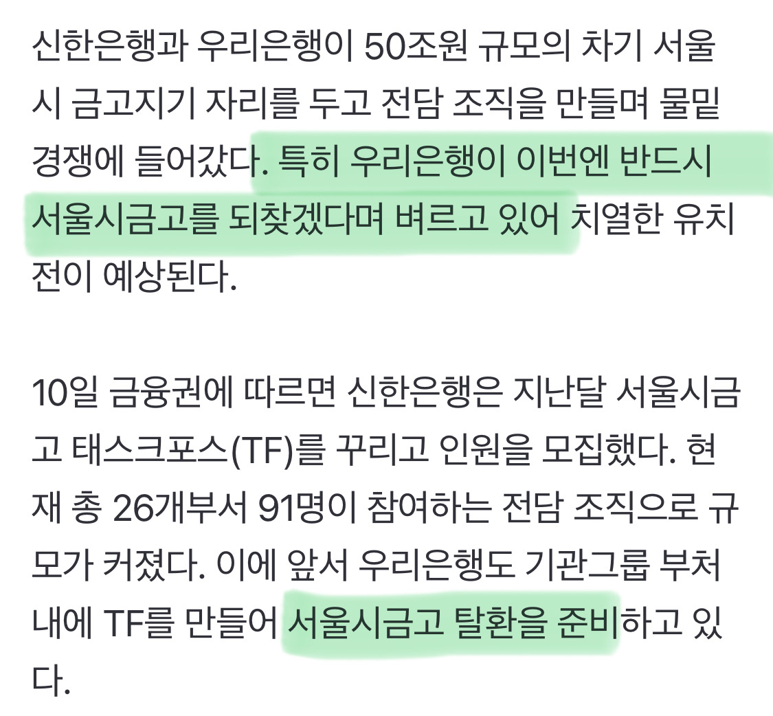 [여시뉴스데스크][단독]50조 서울시 금고 잡아라…신한·우리 TF 만들어 물밑 경쟁 작성자(본인닉네임).|작성시간25.12.10|조회수2,766 목록 댓글 2 글자크기 작게가 글자크기 크게가 출처: https://n.news.naver.com/article/008/0005289707?sid=101우리은행 이갈고 있구낰ㅋㅋㅋㅋㅋㅋㅋㅋㅋ 다음검색 현재 게시글 추가 기능 열기 북마크 공유하기 신고 센터로 신고 댓글 댓글 2 댓글쓰기 답글쓰기 댓글 리스트 작성자이끼류 | 작성시간 25.12.10 주거래는 신한이지만 주식은 우리은행걸 들고 있으므롴ㅋㅋㅋㅋ 우리은행 성공하길 ㅋㅋㅋ 작성자오늘의고백 | 작성시간 25.12.10 개발자지인이 우리은행 시금고 플젝 지금 개힘들다는데ㅋㅋㅋㅋㅋ어쩐지 이를 갈아서 존나 힘들어햇군아..^^ 댓글 전체보기