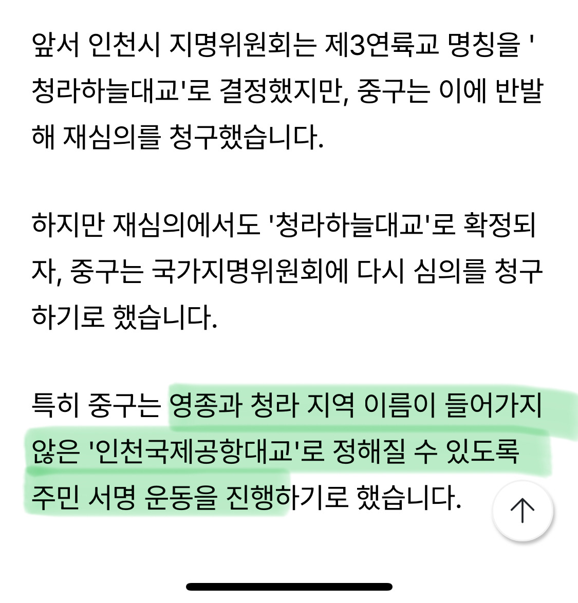 작성자banapresso 작성시간 25.12.10 중립적 이름으로 하든지 ㅋㅋㅋ 청라하늘대교는 뭔데… 영종도도 돈 냈는데 그냥 하늘로 퉁치자는거임?