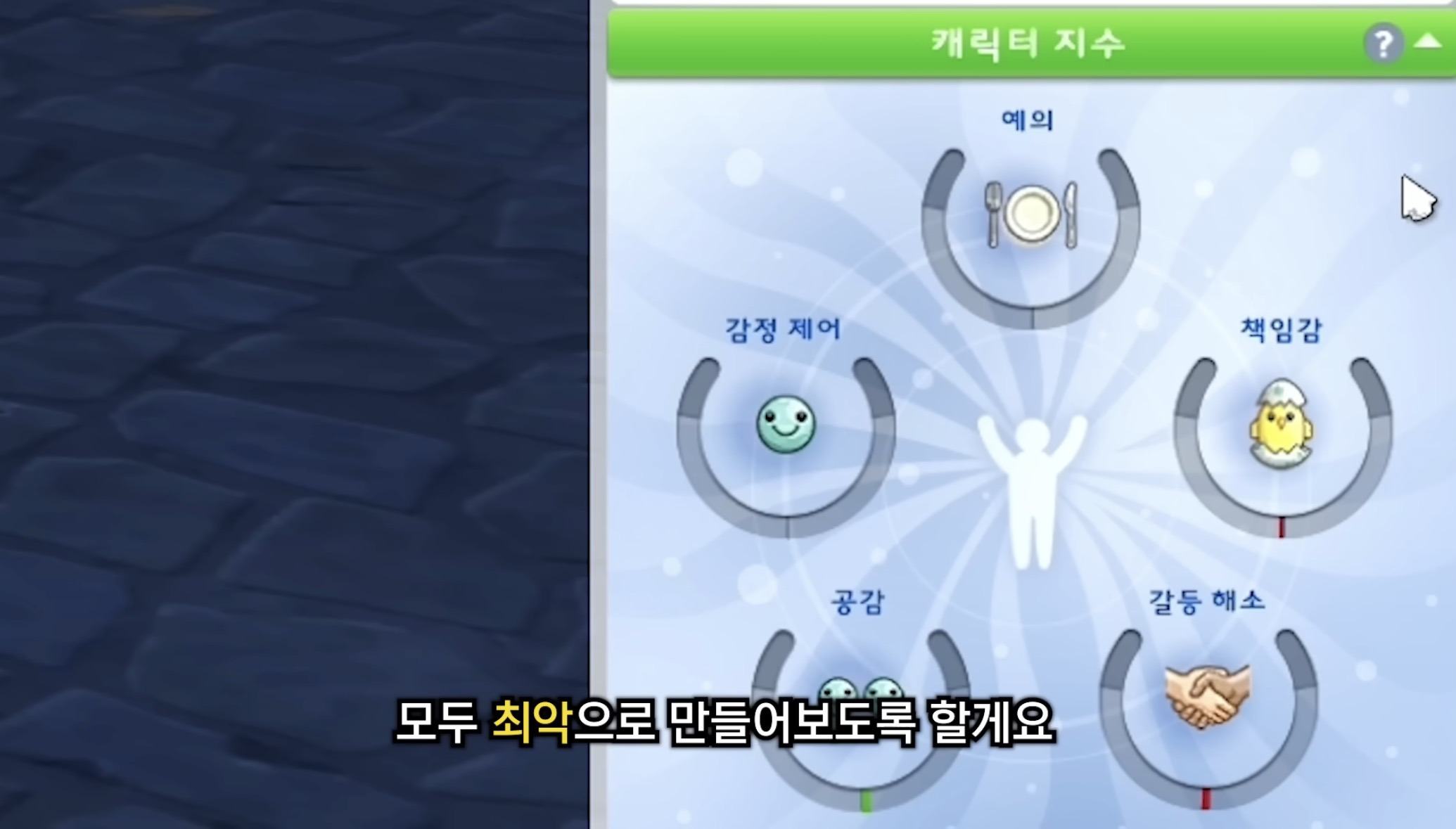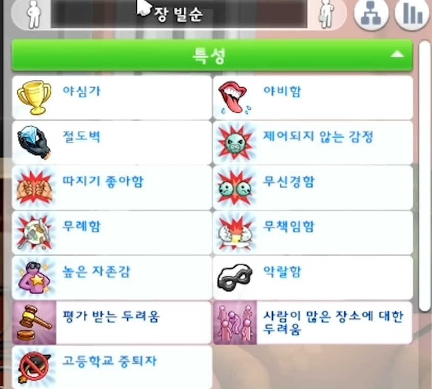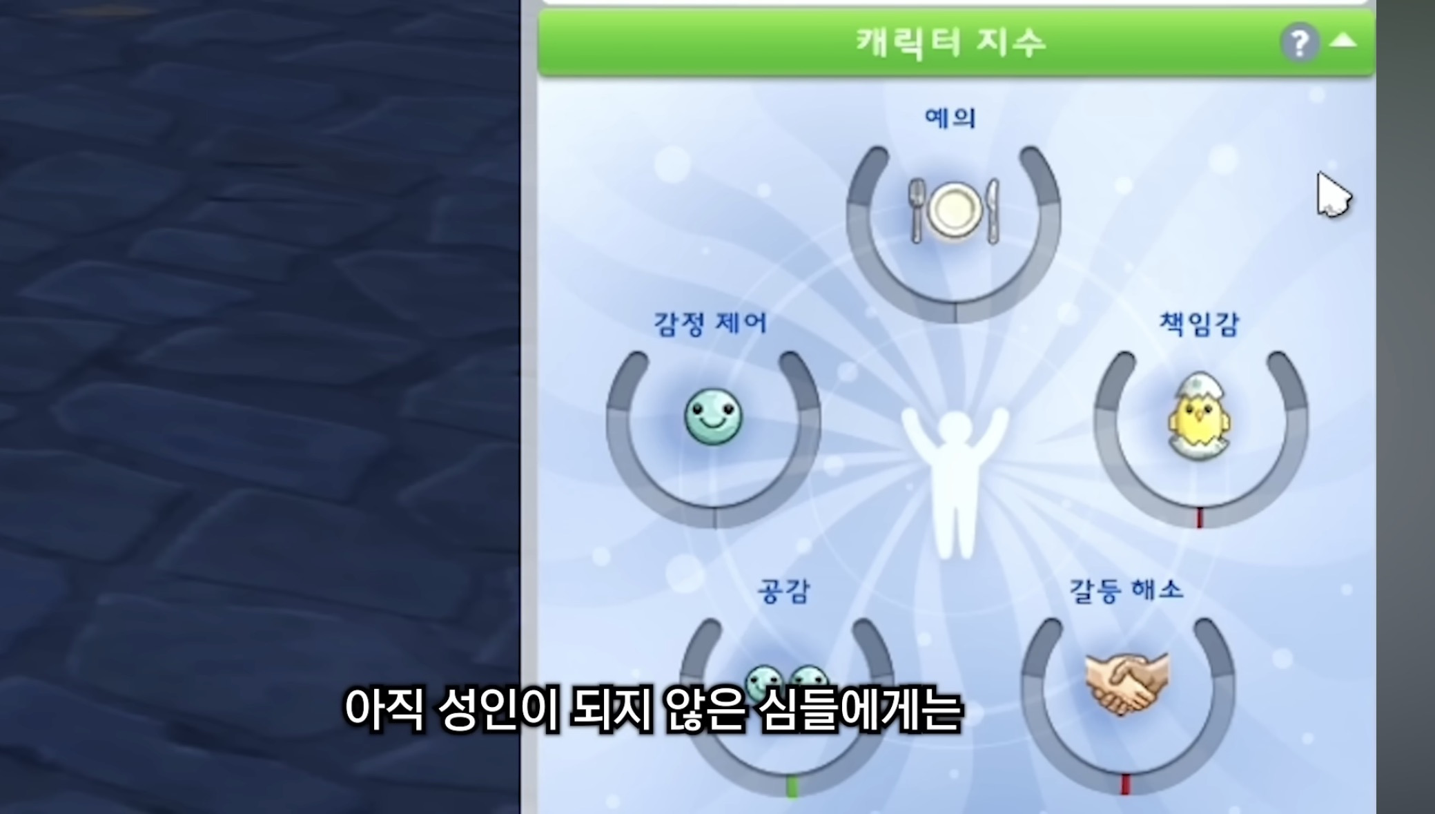 심즈에서 아직 성인이 되지 않은 심들은 캐릭터지수가 있는데 얘네가 어느쪽에 기우느냐에 따라 성인이 되면 얻는 성격이 달라짐