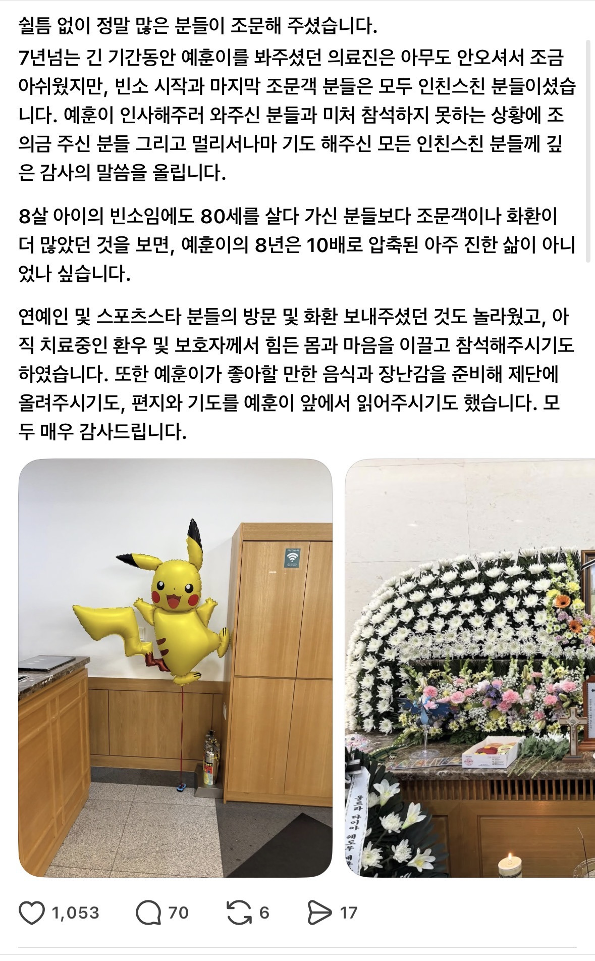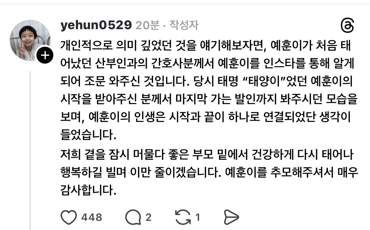[눈물한방울]조금 전에 올라온 예훈이 글 작성자Sunmoonstar02|작성시간25.12.10|조회수114,921 목록 댓글 417 글자크기 작게가 글자크기 크게가 출처: https://www.dmitory.com/issue/392123434이슈/유머 - 조금 전에 올라온 예훈이 글익명 정보 커뮤니티 사이트www.dmitory.com그곳에선 아프지 않고 편안하길.. 다음검색 현재 게시글 추가 기능 열기 북마크 공유하기 신고 센터로 신고 댓글 댓글 417 댓글쓰기 답글쓰기 댓글 리스트 작성자카스 프레쉬 | 작성시간 25.12.16 예훈아 고생많았어 거기선 아프지말고 푹쉬어 작성자수족냉증의계절 | 작성시간 25.12.16 삼가 고인의 명복을 빕니다 작성자씨리얼 | 작성시간 25.12.16 삼가 고인의 명복을 빕니다.. 작성자바게뜨2 | 작성시간 25.12.19 평소에도 의료진에 대한 원망이 많이 쌓여있었던 것 같음 작성자케이크와 아메리카노 | 작성시간 25.12.20 예훈아 좋은곳에서 편히 쉬고있어... 댓글 전체보기