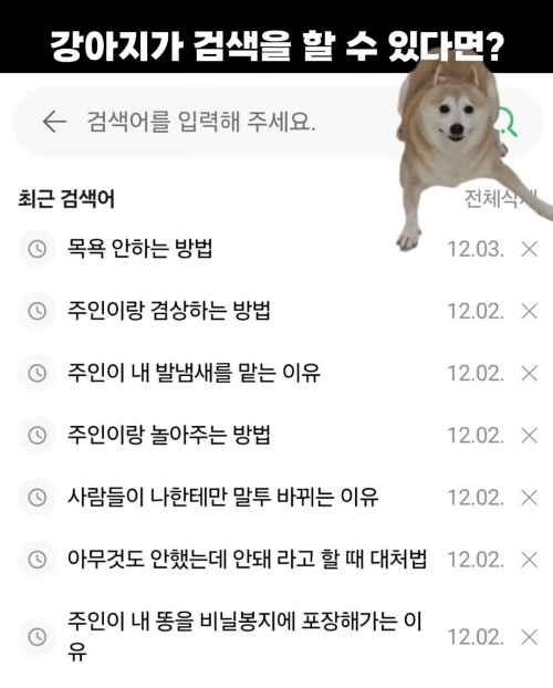 [흥미돋]우리집 강아지가 검색할 수 있다면 무슨 내용일지 궁예해보는 달글 작성자이제추버요|작성시간25.12.11|조회수13,390 목록 댓글 87 글자크기 작게가 글자크기 크게가 출처: 여성시대 (이제추버요)https://www.instagram.com/bonggoo_1121 다음검색 현재 게시글 추가 기능 열기 북마크 공유하기 신고 센터로 신고 댓글 댓글 87 댓글쓰기 답글쓰기 댓글 리스트 작성자유정부인 | 작성시간 25.12.11 자꾸 숨차는 이유 작성자글세다 | 작성시간 25.12.11 주인이 술만먹으면 왤케 나를 애타게 찾는지 그 이유 산책나가서 몰래 목줄 푸르는법목욕 안하는법 작성자새우탱탱돈까스 | 작성시간 25.12.11 누나가 맨날 보고있는 조그마한 네모가 뭔가요.. 작성자석양 위 헬레나 | 작성시간 25.12.11 엄마랑 하루종일 같이 있는법 작성자크러쉬-SKIP | 작성시간 25.12.12 엄마랑 소통하는 법엄마가 내말 알아듣는법 댓글 전체보기