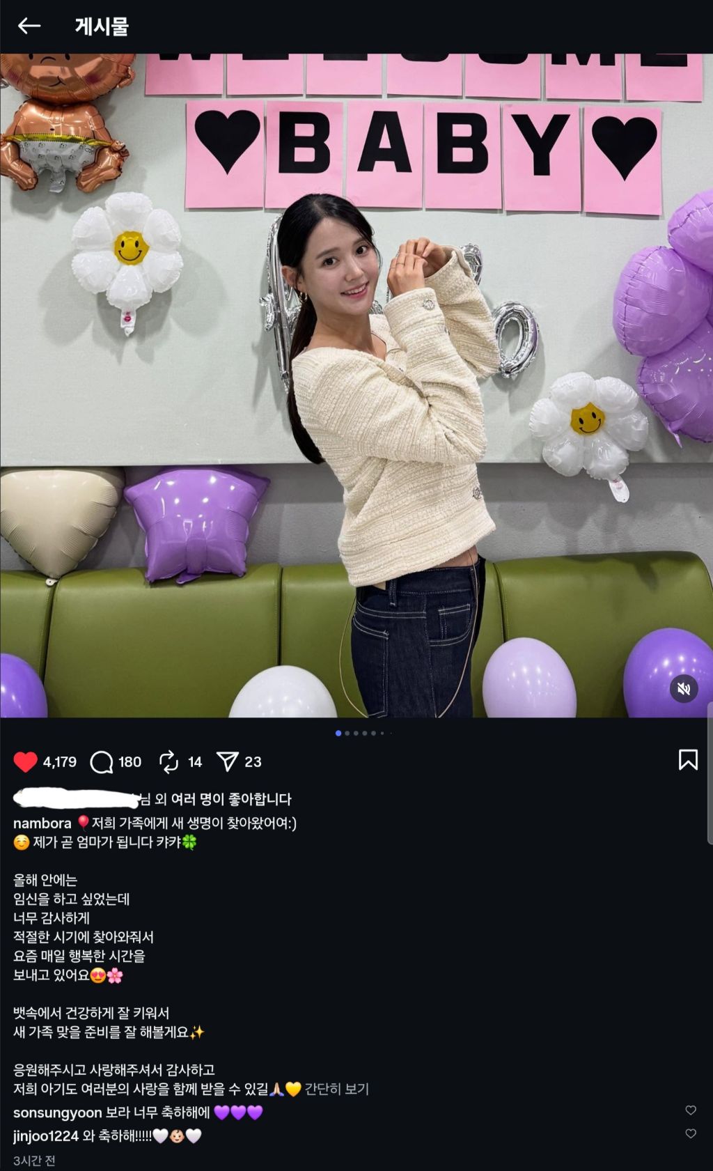 [흥미돋]배우 남보라 임신 작성자칵테일 사랑|작성시간25.12.11|조회수172,934 목록 댓글 197 글자크기 작게가 글자크기 크게가 출처: 여성시대 칵테일 사랑🎈저희 가족에게 새 생명이 찾아왔어여:)☺️ 제가 곧 엄마가 됩니다 캬캬🍀올해 안에는임신을 하고 싶었는데너무 감사하게적절한 시기에 찾아와줘서요즘 매일 행복한 시간을보내고 있어요😍🌸뱃속에서 건강하게 잘 키워서새 가족 맞을 준비를 잘 해볼게요✨응원해주시고 사랑해주셔서 감사하고저희 아기도 여러분의 사랑을 함께 받을 수 있길🙏🏻💛 다음검색 현재 게시글 추가 기능 열기 북마크 공유하기 신고 센터로 신고 댓글 댓글 197 댓글쓰기 답글쓰기 댓글 리스트 작성자Doctor Strange | 작성시간 25.12.15 젤리곰시긴갘ㅋㅋㅋ존귀 작성자불침번 | 작성시간 25.12.15 저렇게귀여운초음파사진처음봐 ㅋㅋㅋ 작성자포카리스웻뚜 | 작성시간 25.12.15 와 진짜 애기 얼마나 잘키울까 ㅋㅋㅋㅋㅋㅋㅋㅋㅋ 작성자둘리두 | 작성시간 25.12.16 귀엽다 ㅋㅋ 행복해 ! 작성자홈런볼런홈 | 작성시간 25.12.21 육아 진짜 잘할 것 같아 댓글 전체보기