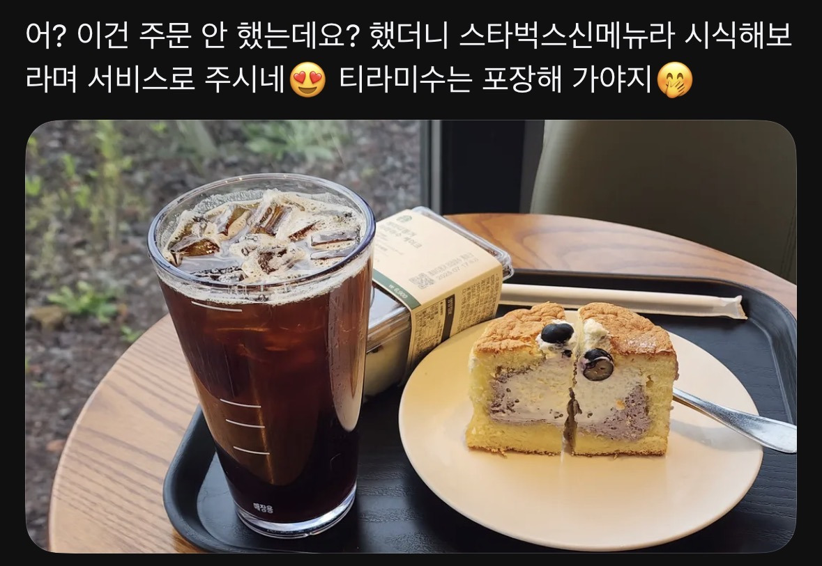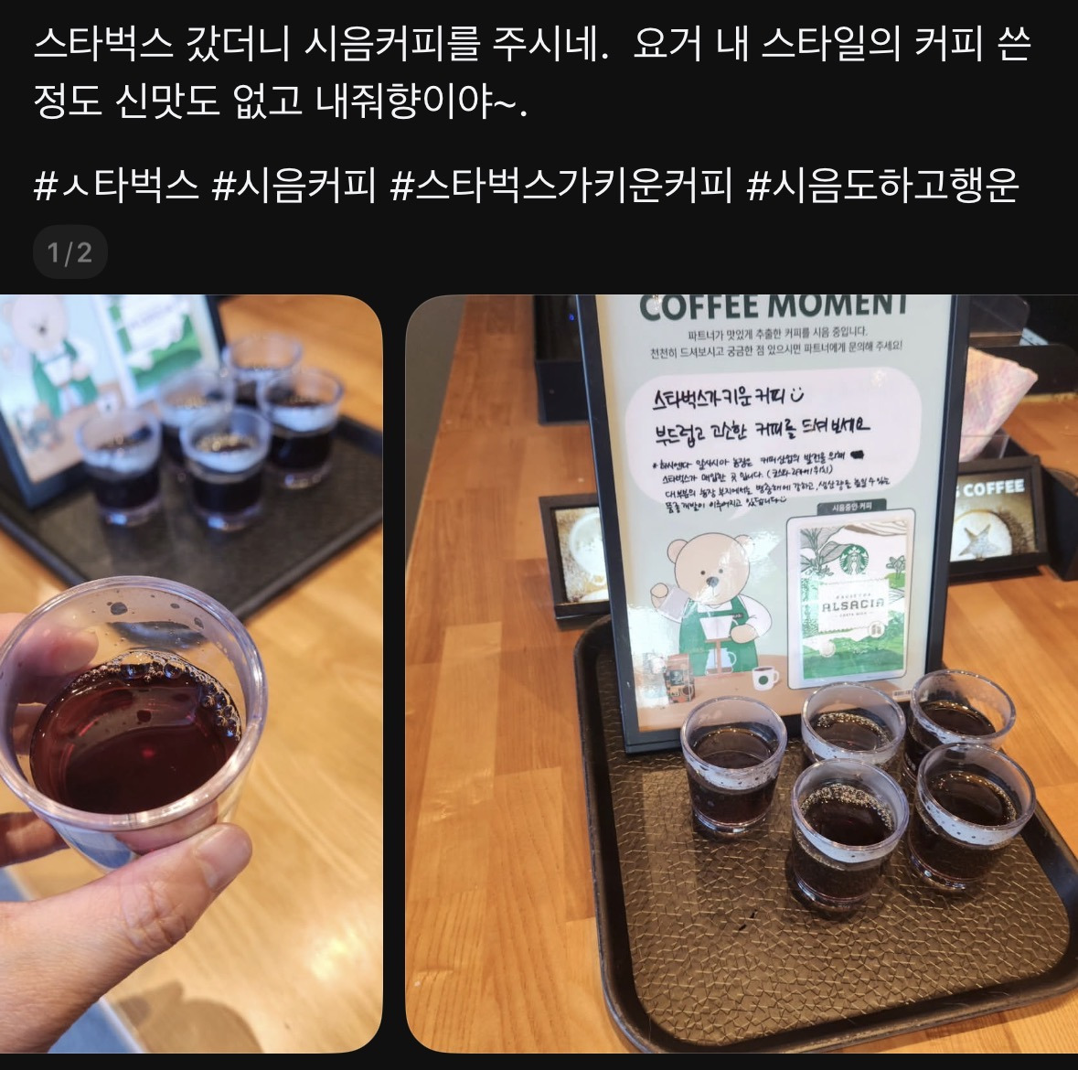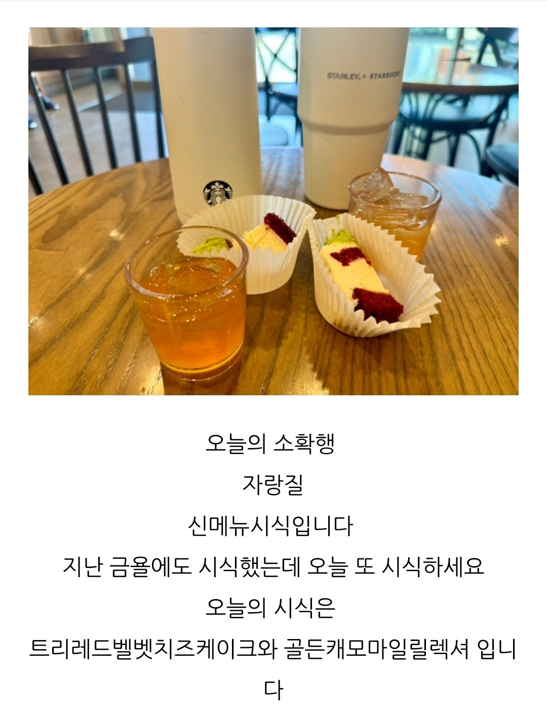 [흥미돋]스타벅스에 앉아있으면 가끔 주는 거.jpg 작성자왓이즈러브|작성시간25.12.11|조회수262,408 목록 댓글 396 글자크기 작게가 글자크기 크게가 출처: https://theqoo.net/square/4024814925신메뉴 시식, 시음 다음검색 현재 게시글 추가 기능 열기 북마크 공유하기 신고 센터로 신고 댓글 댓글 396 댓글쓰기 답글쓰기 댓글 리스트 작성자블랙글레이즈드라테 | 작성시간 25.12.18 너무 고마웠어ㅜㅜㅜ 작성자밀로앤아버지 | 작성시간 25.12.18 우와 처음알았어 작성자아기 망곰 | 작성시간 25.12.18 나도 몇번 먹어봐서 좋았어 작성자재밌다재밌어 | 작성시간 25.12.19 몇년간 딱 1번 받아봄 ㅋㅋ 작성자머시랑 | 작성시간 25.12.19 너무 좋앗어 이건 신메뉴 나올때 주는건가? 아님 나오기 전? 댓글 전체보기