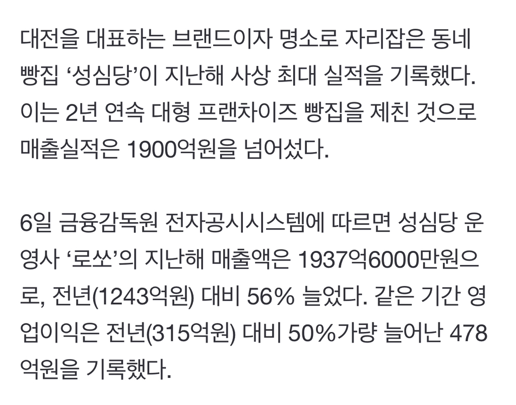 [스크랩] [흥미돋]성심당 또 일냈다, 연 매출 2000억 육박···2년 연속 영업익 대형 프랜차이즈 제쳐 작성자umbrella|작성시간25.12.11|조회수10,924 목록 댓글 55 글자크기 작게가 글자크기 크게가 출처: https://n.news.naver.com/article/032/0003361484?sid=101성심당 또 일냈다, 연 매출 2000억 육박···2년 연속 영업익 대형 프랜차이즈 제쳐대전을 대표하는 브랜드이자 명소로 자리잡은 동네 빵집 ‘성심당’이 지난해 사상 최대 실적을 기록했다. 이는 2년 연속 대형 프랜차이즈 빵집을 제친 것으로 매출실적은 1900억원을 넘어섰다. n.news.naver.com전문 출처로뚜쥬가 200억인데 성심당이 2000억 ㄷㄷㄷㄷㄷ 다음검색 스크랩 원문 : *여성시대* 차분한 20대들의 알흠다운 공간 현재 게시글 추가 기능 열기 북마크 공유하기 신고 센터로 신고 댓글 댓글 55 댓글쓰기 답글쓰기 댓글 리스트 작성자영부인김혜경 | 작성시간 25.12.11 사랑해 성심당 ♡ 작성자포악 | 작성시간 25.12.11 성심당 응원해 사랑해 작성자Amoroso | 작성시간 25.12.11 대단하다 캬 작성자천년의노래 | 작성시간 25.12.11 존나 맛잇어...딸기 나오면 또 간다 작성자WonderwaII | 작성시간 25.12.11 와 돈방석길만걸으시길.. 그전에 제발 나도 딸기시루힌번만먹어보고싶다ㅠㅠㅠㅠ 댓글 전체보기