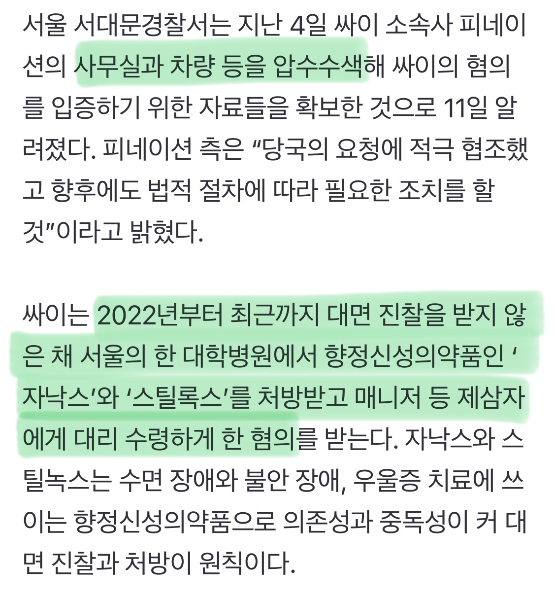 [여시뉴스데스크]수면제 대리수령 의혹, 싸이 소속사 등 압수수색 작성자(본인닉네임).|작성시간25.12.11|조회수12,493 목록 댓글 18 글자크기 작게가 글자크기 크게가 출처: https://n.news.naver.com/article/005/0001819845?sid=102 다음검색 현재 게시글 추가 기능 열기 북마크 공유하기 신고 센터로 신고 댓글 댓글 18 댓글쓰기 답글쓰기 댓글 리스트 작성자정보학 | 작성시간 25.12.11 심지어 대학병원에서....? 작성자엉뜨키라고 | 작성시간 25.12.11 연예인이 상전이라 개흔할듯 작성자2025년토익800 | 작성시간 25.12.11 …헐 작성자이상한놈들끼리모아놔라 | 작성시간 25.12.11 ㅡㅡ 작성자뵤뵤뵷뵤 | 작성시간 25.12.11 싸이는 반응 왜케 없지 댓글 전체보기