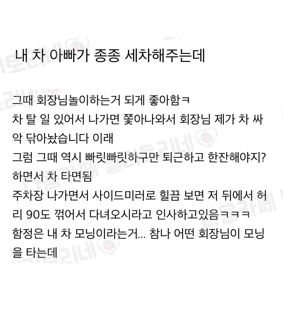 [흥미돋]내 차 아빠가 종종 세차해주는데 작성자알티드래곤|작성시간25.12.11|조회수15,283 목록 댓글 15 글자크기 작게가 글자크기 크게가 출처: 여성시대 알티드래곤 밀리토리 다음검색 현재 게시글 추가 기능 열기 북마크 공유하기 신고 센터로 신고 댓글 댓글 15 댓글쓰기 답글쓰기 댓글 리스트 작성자파랑냥이 | 작성시간 25.12.11 ㅋㅋㅋㅋㅋㅋㅋㅋㅋㅋㅋ귀여웤ㅋㅋㅋ 작성자돈줘시핥 | 작성시간 25.12.11 아부지 나 줘 작성자컨텍스트 | 작성시간 25.12.11 아 너므 귀여웤ㅋㅋㅋㅋㅋㅋㅋㅋㅋ재밌닼ㅋㅋㅋㅋㅋㅋㅋㅋㅋㅋㅋㅋㅋ 작성자지금지금지금 | 작성시간 25.12.11 아빠 개웃곀ㅋㅋㅋㅋ 작성자Amoroso | 작성시간 25.12.12 둘다 귀엽 ㅠㅠㅠㅠㅋㅋ 댓글 전체보기