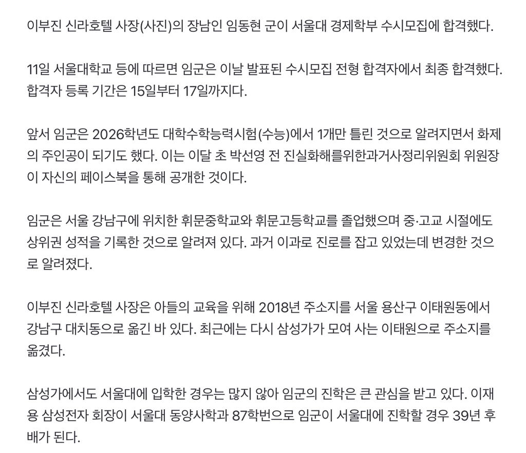 [여시뉴스데스크][단독] 이부진 신라호텔 사장 장남 임동현군 서울대 경제학부 합격 작성자Affirma|작성시간25.12.11|조회수56,725 목록 댓글 193 글자크기 작게가 글자크기 크게가 출처: 여성시대 (Affirma)https://n.news.naver.com/mnews/article/009/0005604875?sid=101[단독] 이부진 신라호텔 사장 장남 임동현군 서울대 경제학부 합격이부진 신라호텔 사장(사진)의 장남인 임동현 군이 서울대 경제학부 수시모집에 합격했다. 11일 서울대학교 등에 따르면 임군은 이날 발표된 수시모집 전형 합격자에서 최종 합격했다. 합격자 n.news.naver.com 다음검색 현재 게시글 추가 기능 열기 북마크 공유하기 신고 센터로 신고 댓글 댓글 193 댓글쓰기 답글쓰기 댓글 리스트 작성자요리조리보보 | 작성시간 25.12.12 1개 졸라아깝다 작성자팔란앜 | 작성시간 25.12.12 잘커서 삼성을 한국을 빛내라 작성자겠냐구 | 작성시간 25.12.12 입학 선물 뭐 받을지 궁금하다 작성자백자의 대가 | 작성시간 25.12.12 잘커라 작성자홍수현 | 작성시간 25.12.13 와 마트에서 이부진이랑 뒷모습 투샷찍힌 걔 맞지? 걔가 벌써 커서 수능본거도 신기하고 한개틀린거도 신기하다.... 댓글 전체보기
