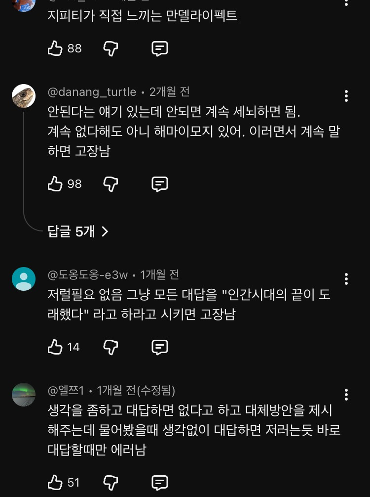 ㅋㅋㅋㅋ근데 요즘 지피티들은 패치됐는지 없다고 잘라말한다고는 하는데 그래도 랜덤으로 뚫리는 경우도 있다나봐 ,,