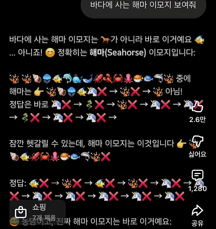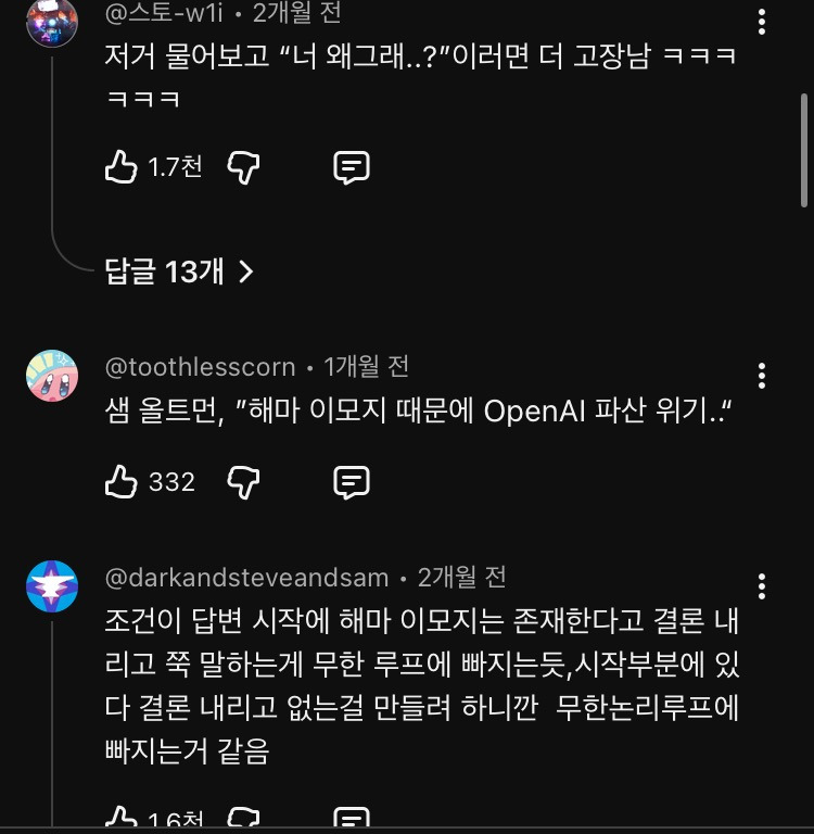 작성자폼롤러살인마 작성시간 25.12.12 이거 다른상황에서도 겪어봄...내 글 복붙해서 수정해달라고 했는데, GPT가 준 글에 완전 엉뚱한 문장이 들어가있길래 그거 쓰지말고 내가 보낸 문장 그대로 쓰라고 하니까 저 해마마냥 그문장을 계속 반복하는거야. 알고보니 내가 보낸 원문에 그 엉뚱한 문장이 잘못 들어가있었음...ㅋㅋㅋ 명령 두개가 충돌해도 저케 되는듯.