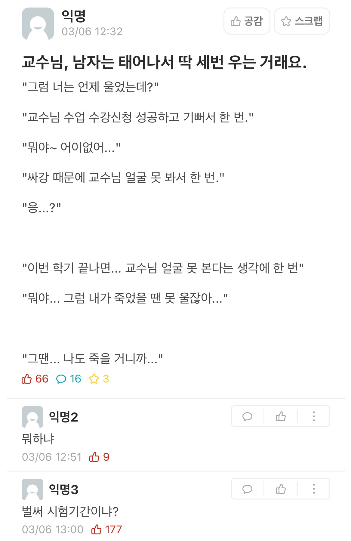 [흥미돋]교수님, 남자는 태어나서 딱 세번 우는 거래요 작성자그렇게 말하면 좋아?|작성시간25.12.11|조회수17,066 목록 댓글 16 글자크기 작게가 글자크기 크게가 출처: https://m.cafe.daum.net/subdued20club/ReHf/3160150?svc=cafeapp교수님, 남자는 태어나서 딱 세번 우는 거래요ㅊㅊ에타m.cafe.daum.netㅊㅊ에타, 쭉빵 다음검색 현재 게시글 추가 기능 열기 북마크 공유하기 신고 센터로 신고 댓글 댓글 16 댓글쓰기 답글쓰기 댓글 리스트 작성자아캔비욜스타 | 작성시간 25.12.12 ㅅㅂ 진짜미치겠메 ㅋㅋㅋㅋㅋ 작성자구라마요마요 | 작성시간 25.12.12 주접ㅋㅋㅋㅋㅋㅋㅋㅋㅋㅋㅋㅋ 작성자헤이댓츠미 | 작성시간 25.12.12 댓글 ㅅㅂ ㅋㅋㅋㅋ 작성자유정부인 | 작성시간 25.12.12 피~ 작성자고래를 타고 떠나는 여행 | 작성시간 25.12.12 ㅋㅋㅋㅋㅋㅋㅋㅋㅋ 벌써 시험기간이구나 ㅋㅋㅋ 댓글 전체보기