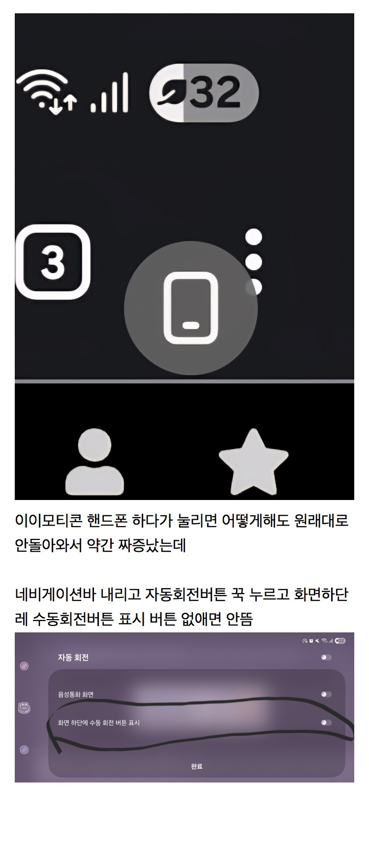 [스크랩] [흥미돋]갤럭시폰 은근히 신경쓰이고 짜증나는 기능 지우기 작성자케언즈|작성시간25.12.11|조회수46,036 목록 댓글 100 글자크기 작게가 글자크기 크게가 출처: https://theqoo.net/square/3913575452 다음검색 스크랩 원문 : *여성시대* 차분한 20대들의 알흠다운 공간 현재 게시글 추가 기능 열기 북마크 공유하기 신고 센터로 신고 댓글 댓글 100 댓글쓰기 답글쓰기 댓글 리스트 작성자냥교 | 작성시간 25.12.12 와 진짜 고마워 바로 껐다 작성자재명혜경 | 작성시간 25.12.12 와 진짜 고마워 아까도 휘리릭 돌아가서 화났는데 여시 덕분에 껐다 고마워 작성자김냥몀 | 작성시간 25.12.12 오 난 이거 태블릿에서 잘쓰는뎈ㅋㅋㅋㅋㅋ가로세로 변경을 하도 많이해서 오히려 잘뜨다가 한번씩 자꾸 안뜨면 짜증나 작성자인생쉽지않구만 | 작성시간 25.12.12 저게 뭐지? 갤럭시 6년 넘게 쓰는데 한번도 못봤어 작성자커피한잔 | 작성시간 26.03.20 와 고마워 댓글 전체보기