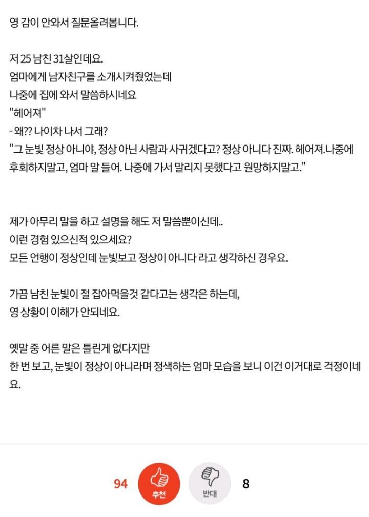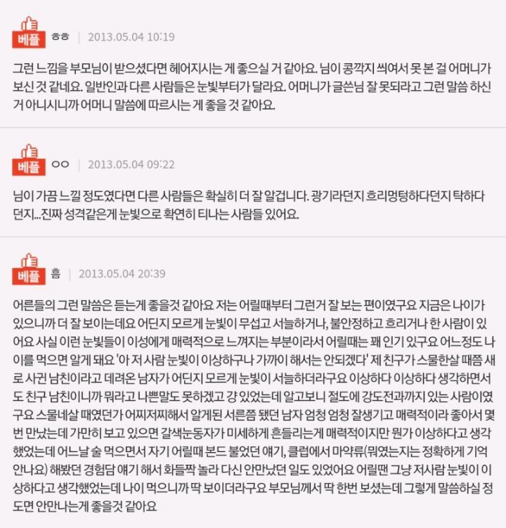 [스크랩] [흥미돋]남자친구 눈빛 때문에 헤어지라는 엄마 작성자상돈|작성시간25.12.12|조회수80,855 목록 댓글 65 글자크기 작게가 글자크기 크게가 출처 : https://m.fmkorea.com/best/3922669197 다음검색 스크랩 원문 : *여성시대* 차분한 20대들의 알흠다운 공간 현재 게시글 추가 기능 열기 북마크 공유하기 신고 센터로 신고 댓글 댓글 65 댓글쓰기 답글쓰기 댓글 리스트 작성자바오바바밥 | 작성시간 25.12.12 어른들 말 들어서 나쁠게 없어... 작성자뭐래는겨 | 작성시간 25.12.12 글서 지금 잘 살아 계시냐구요 작성자제가요 | 작성시간 25.12.12 ㄹㅇ쎄믈리에가 괜히있는게아님 다 빅데이터 통계학임.. 남자눈빛쎄하다? 걍 엮이지도말아야함.. 작성자밤톨이밤토리 | 작성시간 25.12.12 동물적 감각임 눈빛은 작성자나무목수풀림 | 작성시간 25.12.12 걍 좀 헤어져라 남자가 뭐라고 고민을해 댓글 전체보기