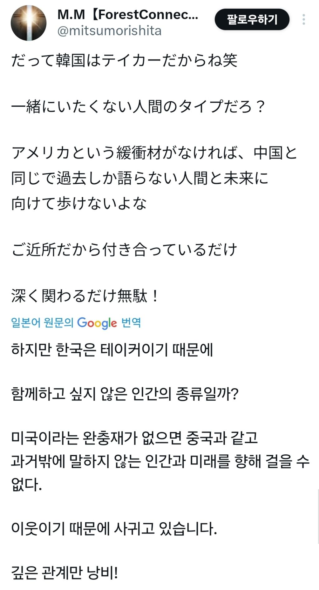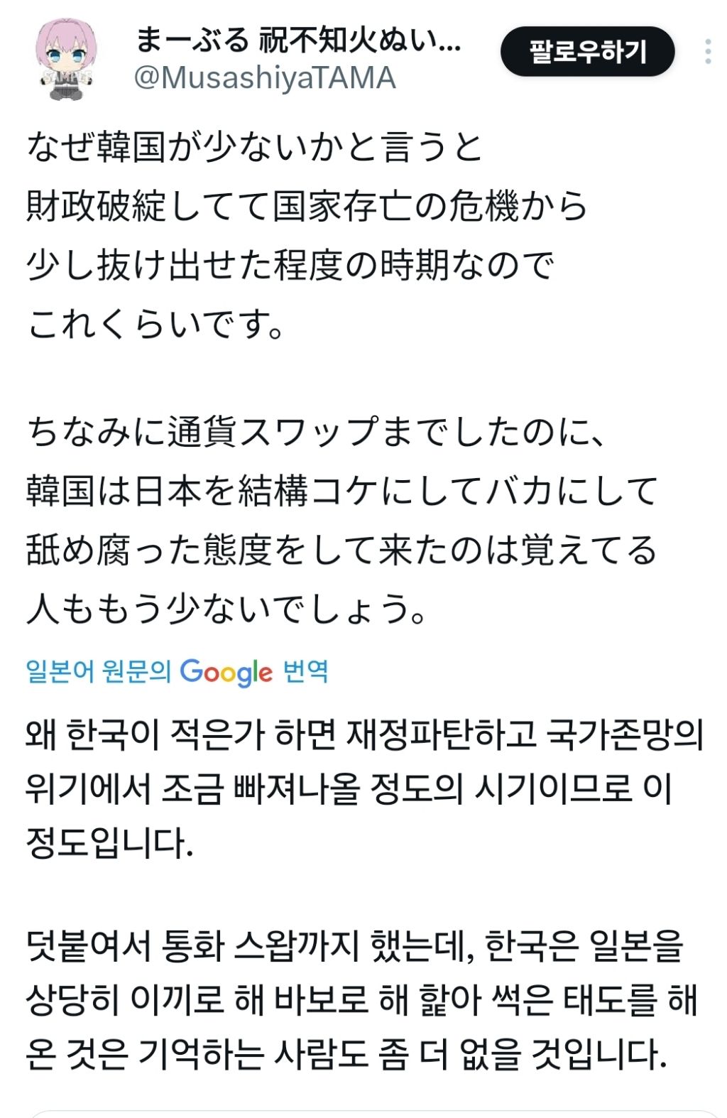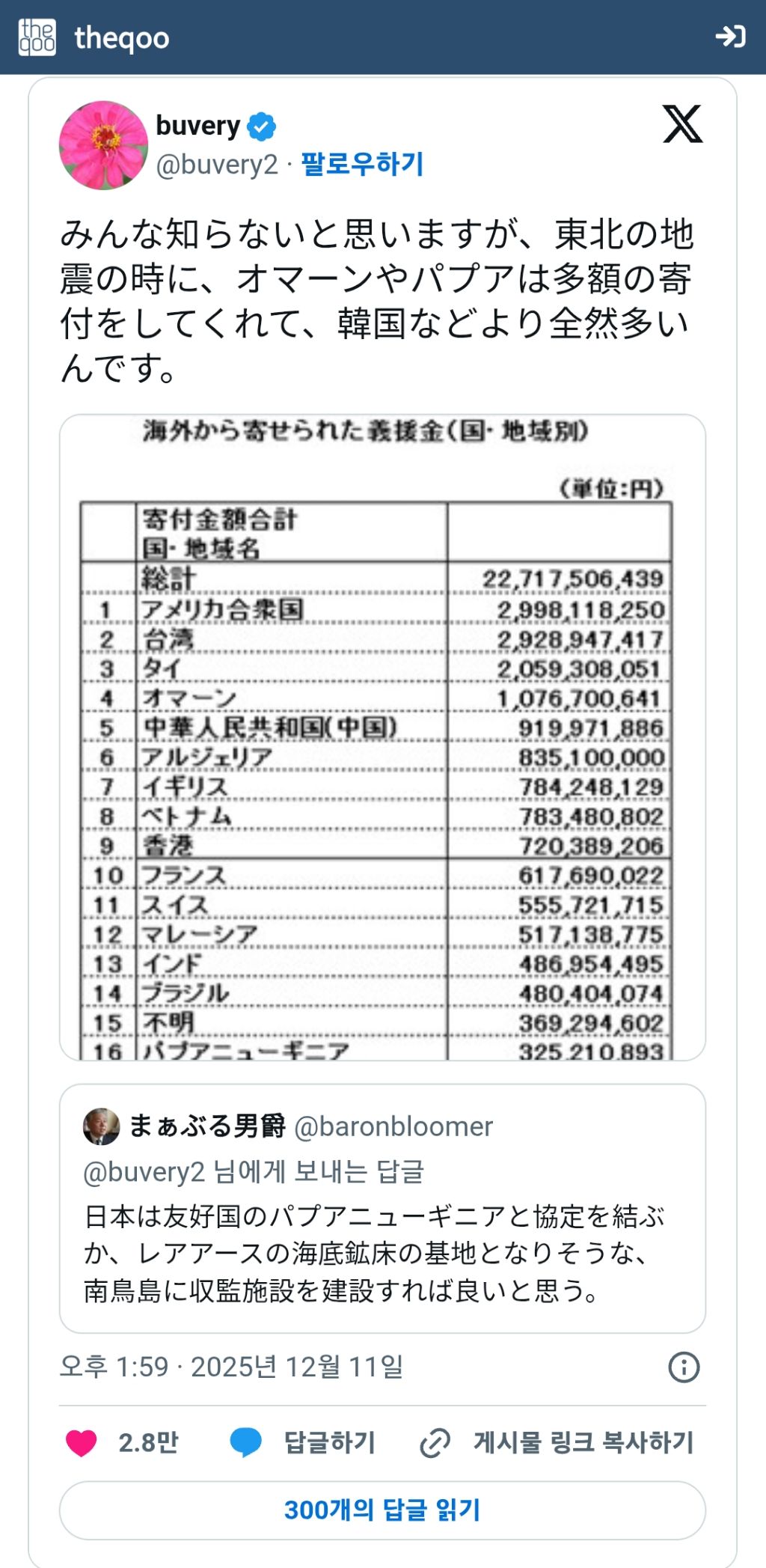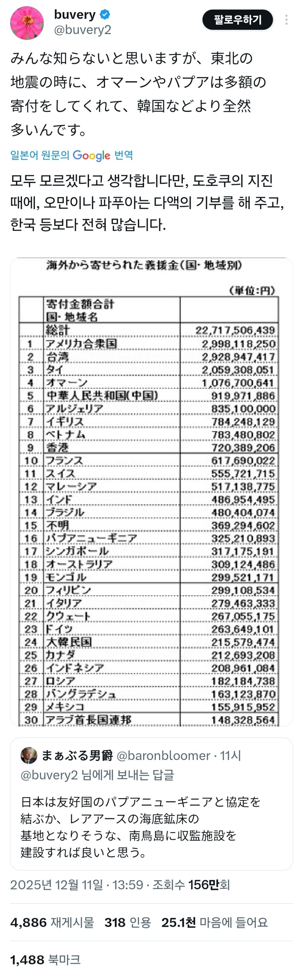 요즘 일본 트위터에서는 중국같은 반일국가들의 관계에 힘쓰지말고 동남아나 기타 친일국가들과의 관계를 더 돈독히 해야된다는 주장이 대세인데(그 와중에 침략 당했어도 친일인 국가가 많다는 개소리는 덤) 그 맥락에서 한국은 동일본 대지진때 기부 적게했다고 돌려까면서 친일국가랑 잘 지내야한다는 일본인과 엄청난 마음수...ㅎㅎ