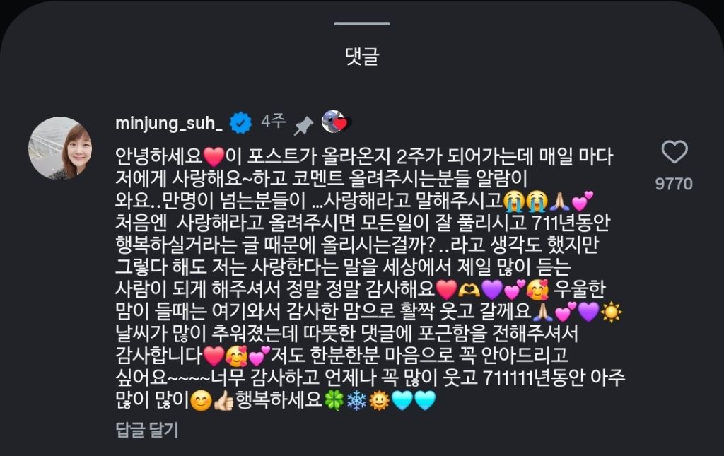 [기타]댓글애 '서민정 사랑해'를 남기면 모든 일이 잘 풀립니다 작성자7H놈들들잡아족치기|작성시간25.12.12|조회수27,909 목록 댓글 1,824 글자크기 작게가 글자크기 크게가 출처: https://www.instagram.com/p/DQjUbz-kdsO/게시물에 달린 서민정 댓글진짜 너무너무 힐링재질이라 낋여왓는데 문제시 서민정사랑해~~ 다음검색 현재 게시글 추가 기능 열기 북마크 공유하기 신고 센터로 신고 댓글 댓글 1,824 댓글쓰기 답글쓰기 댓글 리스트 작성자파코파쿠 | 작성시간 26.01.04 서민정 사랑해 작성자뭘 해도 잘 될 사람 | 작성시간 26.01.06 서민정 사랑해 작성자텔미텔미테테ㅌ테테텔미 | 작성시간 26.01.06 서민정 사랑해 작성자그레이스리를 석방하라 석방하라 | 작성시간 26.01.07 서민정 사랑해 작성자라테일 할 사람 | 작성시간 26.03.30 서민정 사랑해 댓글 전체보기