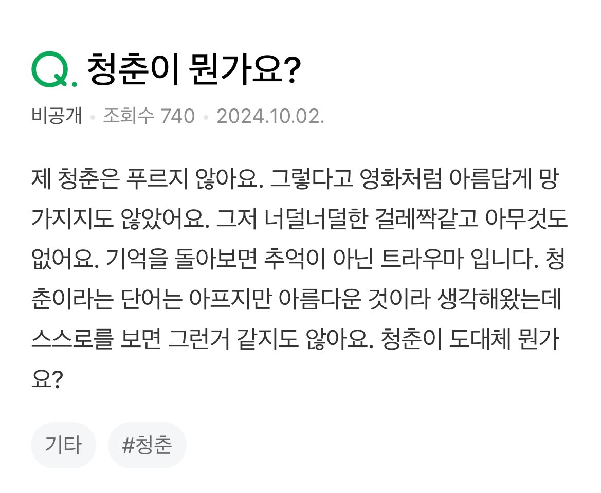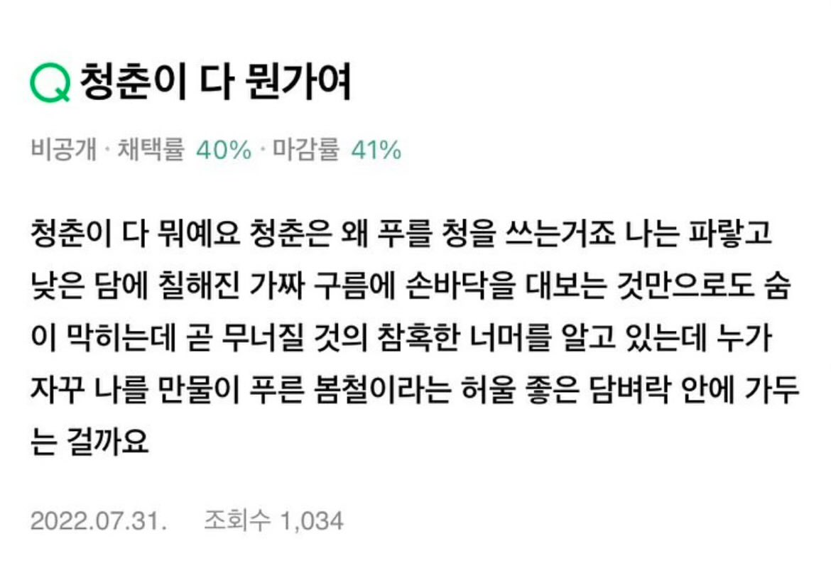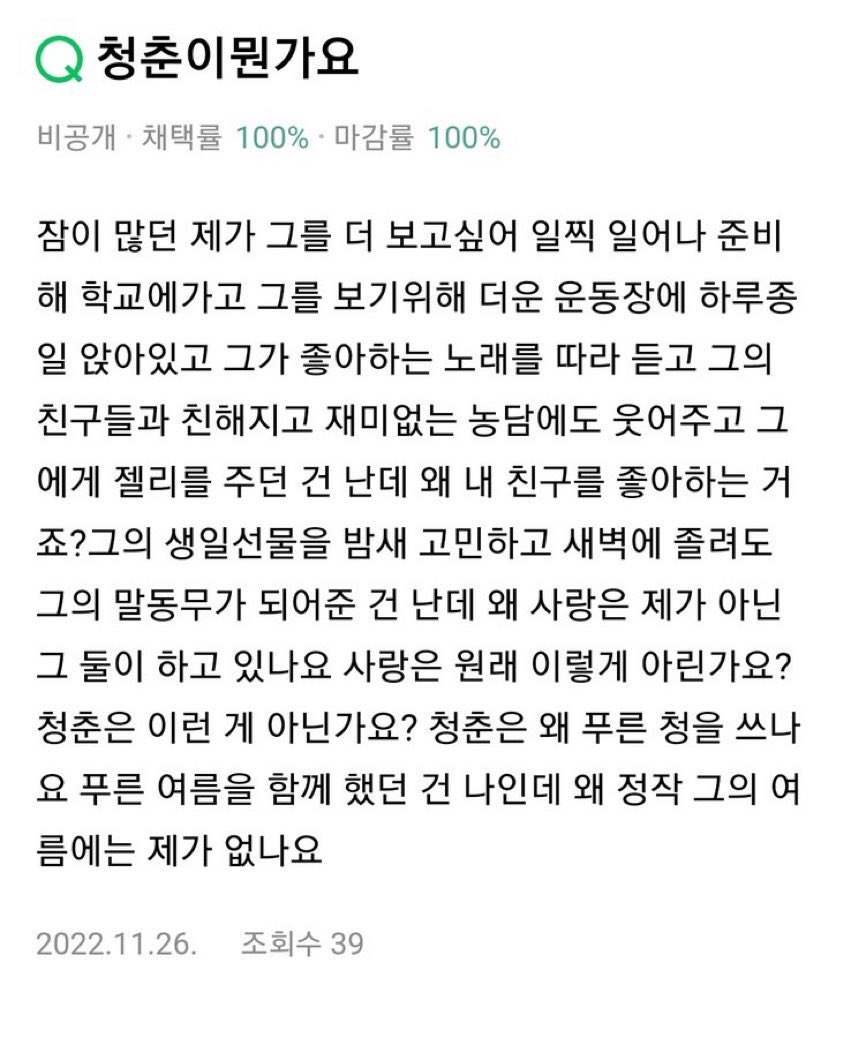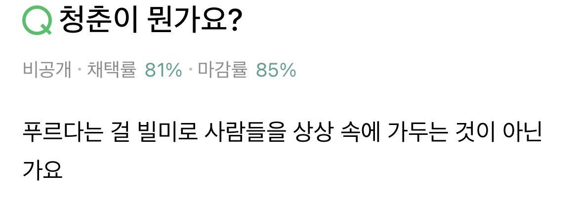 난 푸르지 못한 청춘에 대한 질문들이 제일 좋음 https://t.co/SdqP7rnHfG pic.twitter.com/dfFSUWhhiZ