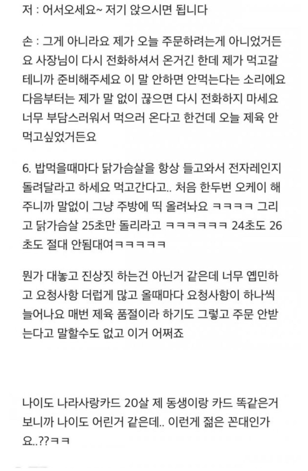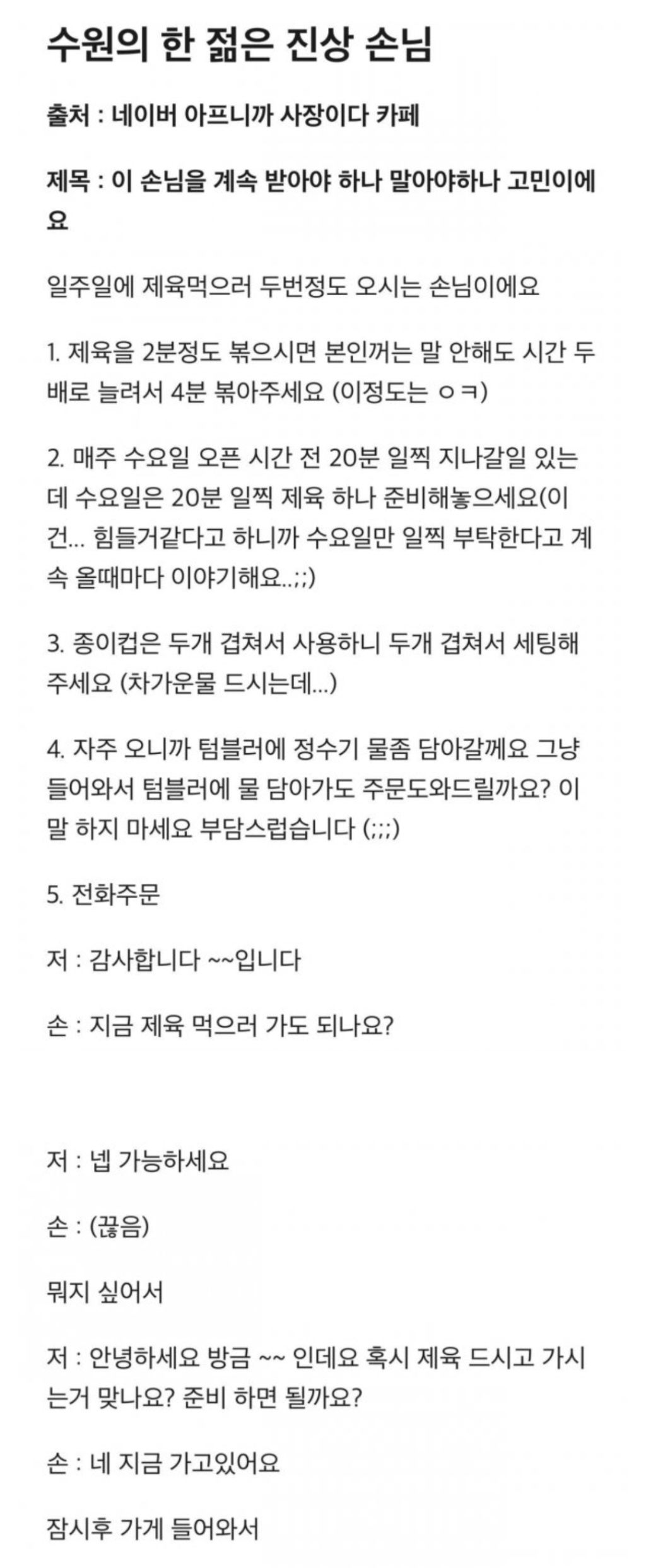 [흥미돋]수원 제육볶음 빌런 작성자우주여시|작성시간25.12.12|조회수19,825 목록 댓글 85 글자크기 작게가 글자크기 크게가 출처: https://m.ppomppu.co.kr/new/bbs_view.php?id=humor&no=720197 다음검색 현재 게시글 추가 기능 열기 북마크 공유하기 신고 센터로 신고 댓글 댓글 85 댓글쓰기 답글쓰기 댓글 리스트 작성자붕어빵죽이기 | 작성시간 25.12.12 아니 그럼 지가 전화를 왜 함 ㅋㅋㅋ 작성자자몽칩 | 작성시간 25.12.12 아;; 개짜증난다 작성자행궁동통닭 | 작성시간 25.12.12 별.. 작성자펫샵충들죽어 | 작성시간 25.12.12 나라면 안받아 미친 ㅡㅡ 작성자고기사랑 | 작성시간 25.12.14 너무 진상인데 댓글 전체보기