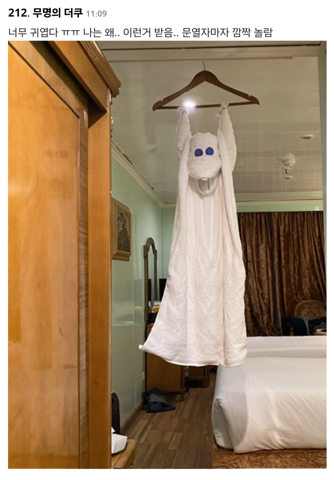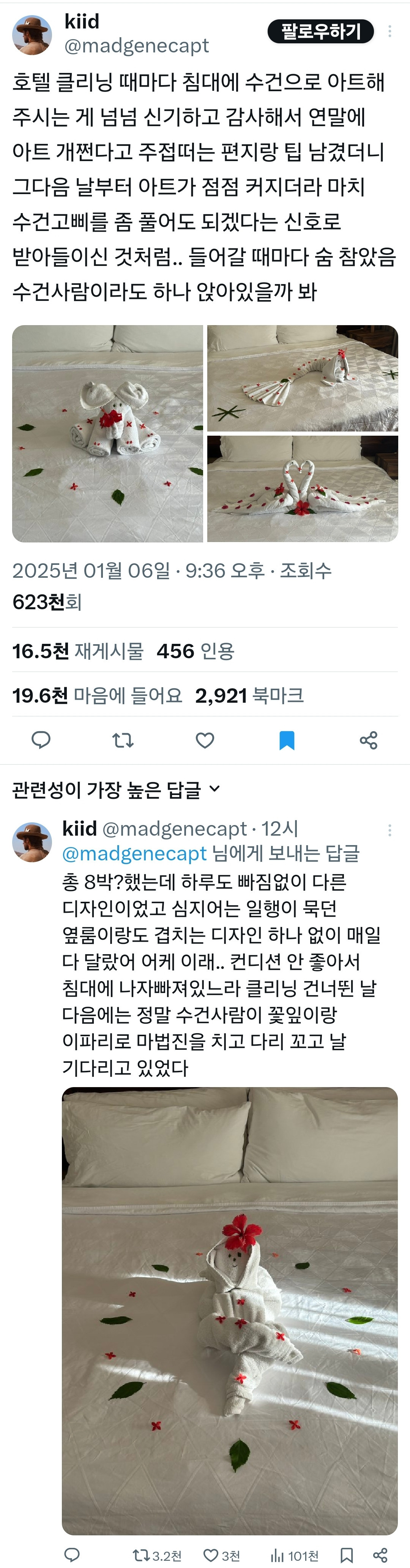 [스크랩] [흥미돋]호텔 클리닝 때마다 침대에 수건으로 아트해 주시는 게 너무 신기하고 감사해서 연말에 아트 개쩐다고 주접떠는 편지랑 팁 남겼더니..twt