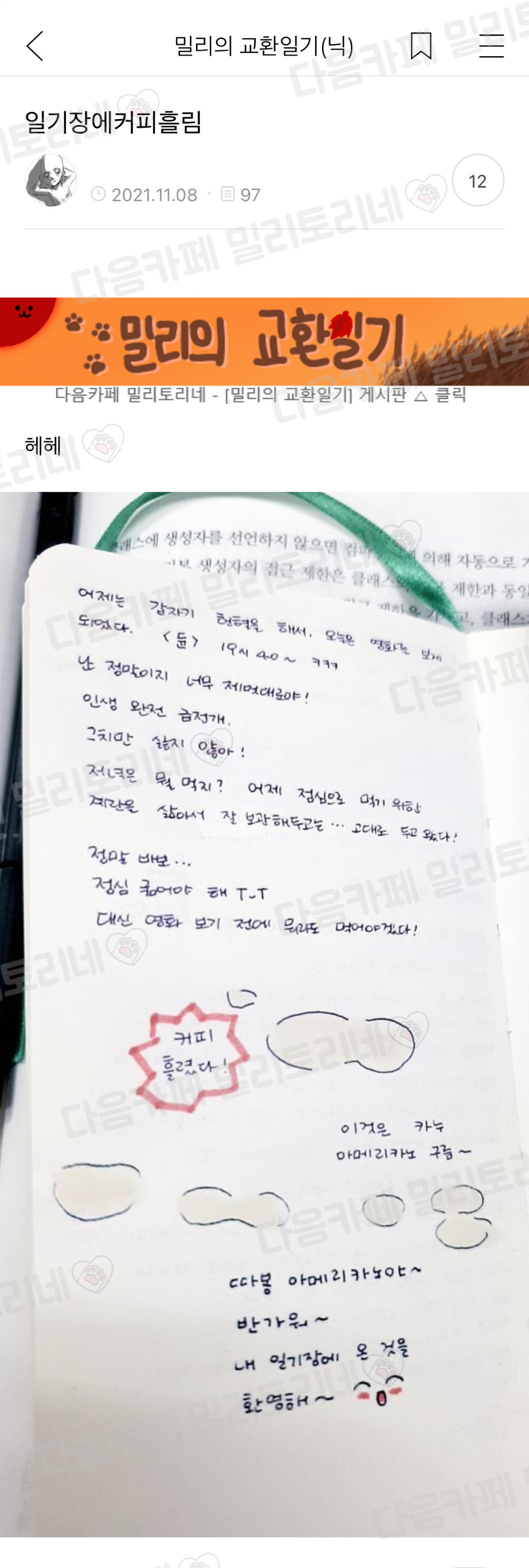 [스크랩] [흥미돋]일기장에 커피 흘림 작성자엿시씌|작성시간25.12.12|조회수38,003 목록 댓글 17 글자크기 작게가 글자크기 크게가 출처 : https://m.cafe.daum.net/baemilytory/91cd/442148?svc=cafeapp[냥귀염] 일기장에커피흘림다음카페 밀리토리네 - 신문보는 밀리 게시판 허락댓 / 클릭시 원글로m.cafe.daum.net카누 아메리카노 구름~ㅇㅅㅇ~ 다음검색 스크랩 원문 : *여성시대* 차분한 20대들의 알흠다운 공간 현재 게시글 추가 기능 열기 북마크 공유하기 신고 센터로 신고 댓글 댓글 17 댓글쓰기 답글쓰기 댓글 리스트 작성자왜사나노 | 작성시간 25.12.12 와 진짜 아름다운 인간상 작성자뇽뇽뇽용뇽뇽 | 작성시간 25.12.12 ㅋㅋㅋ인삼고구마에서 고구마같앵 작성자Amoroso | 작성시간 25.12.12 너무 긍정적이고 귀여우시다 작성자명작끌올하는여시 | 작성시간 25.12.12 ㅋㅋㅋㅋㅋㅋㅋㅋㅋㅋㅋㅋㅋ 작성자오잉또잉뾰잉 | 작성시간 25.12.13 귀엽다 나였으면 오늘도 가지가지하네 라고 썼을텐데 댓글 전체보기