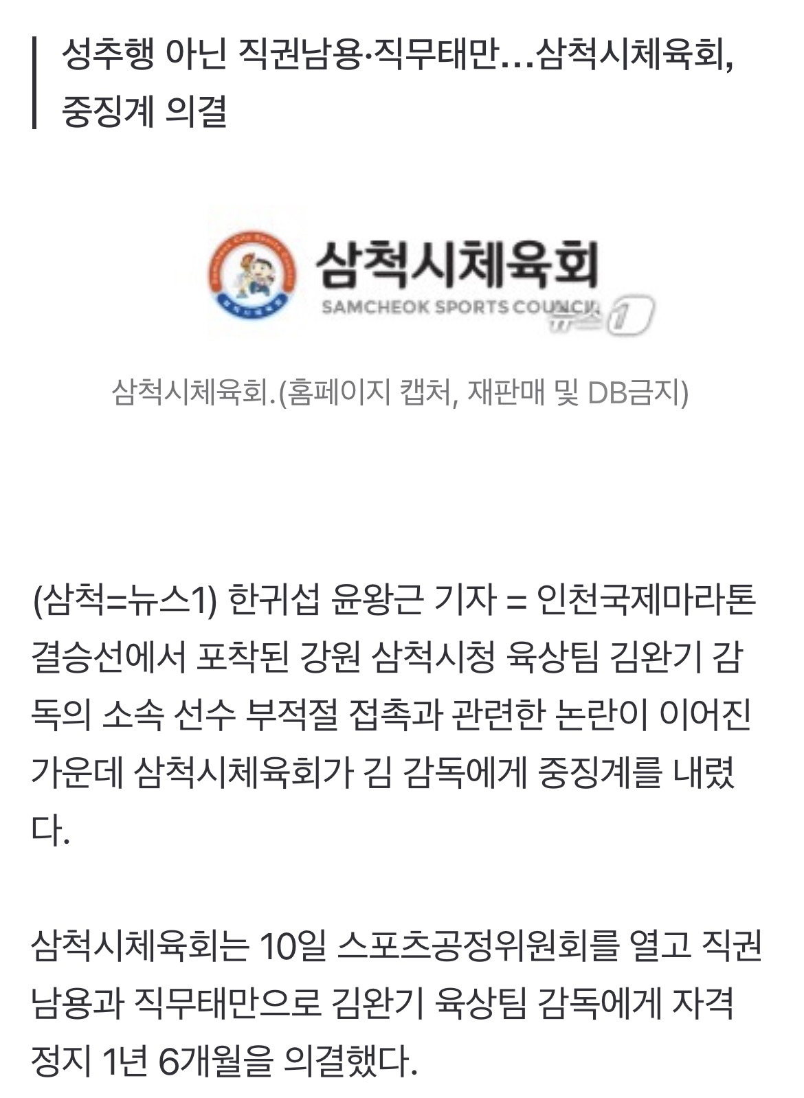 [여시뉴스데스크]'신체접촉 논란' 마라톤 김완기 감독, 자격정지 1년6개월…이유 보니 작성자본인닉내임|작성시간25.12.12|조회수7,082 목록 댓글 5 글자크기 작게가 글자크기 크게가 출처: https://n.news.naver.com/article/421/0008654124?sid=102'신체접촉 논란' 마라톤 김완기 감독, 자격정지 1년6개월…이유 보니한귀섭 윤왕근 기자 = 인천국제마라톤 결승선에서 포착된 강원 삼척시청 육상팀 김완기 감독의 소속 선수 부적절 접촉과 관련한 논란이 이어진 가운데 삼척시체육회가 김 감독에게 중징계를 내n.news.naver.com 다음검색 현재 게시글 추가 기능 열기 북마크 공유하기 신고 센터로 신고 댓글 댓글 5 댓글쓰기 답글쓰기 댓글 리스트 작성자잘 풀리는 휴지 | 작성시간 25.12.12 그정도만..? 삭제된 댓글입니다. 답댓글 작성자본인닉내임 작성자 본인 여부 작성자 | 작성시간 25.12.12 일단 선수 입장은 이래 이미지 확대 작성자실비김치양념에밥비벼먹기 | 작성시간 25.12.12 저정도 문제있는 사람을 제명 시켜야지 무슨 1년 6개월 정지 작성자에너지리프팅케어 | 작성시간 25.12.12 영상 겁나 불쾌했어 진짜 댓글 전체보기