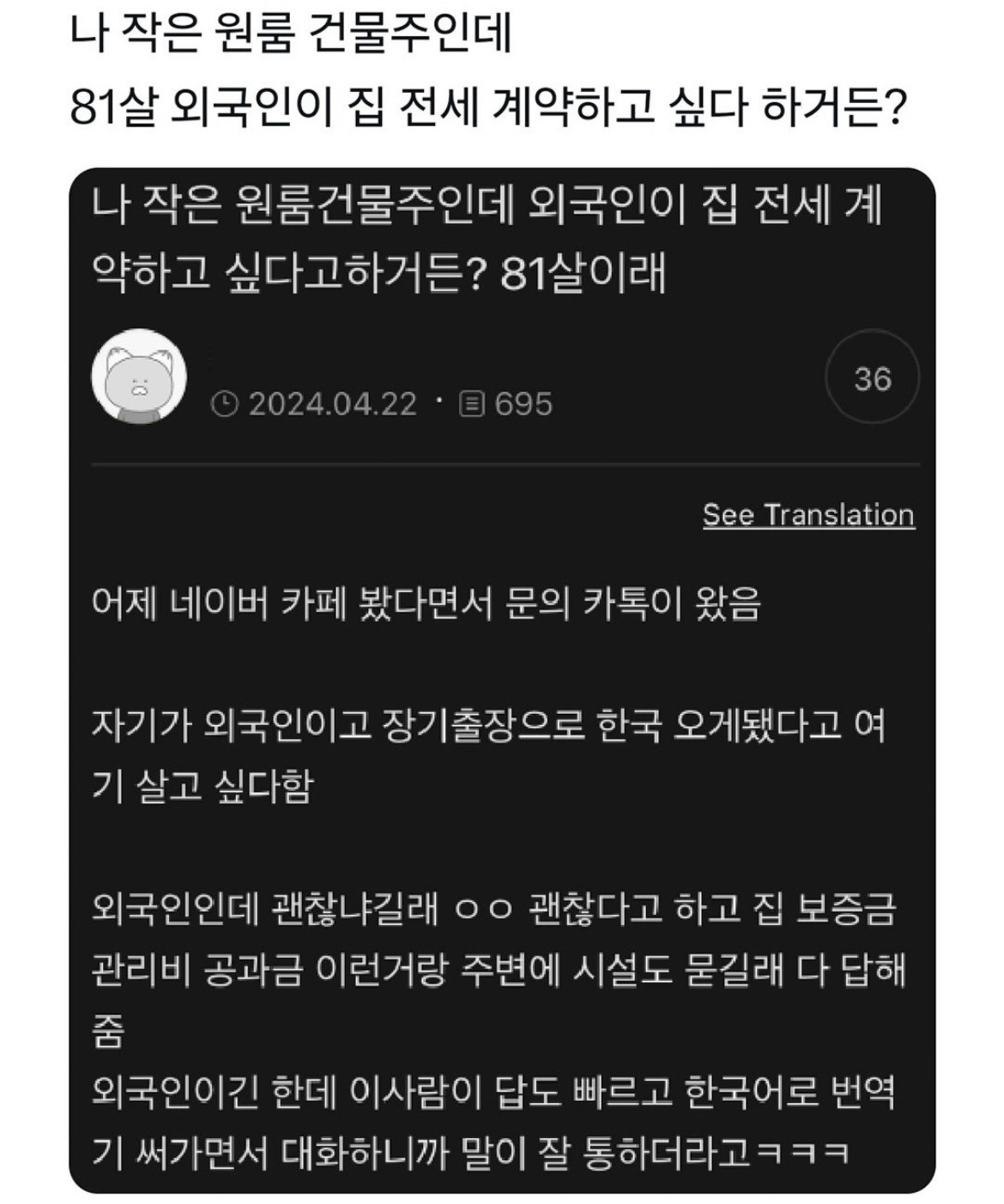 [스크랩] [흥미돋]나 원룸 건물주인데 81살 외국인이 전세 계약 한대 작성자엿시씌|작성시간25.12.12|조회수74,643 목록 댓글 75 글자크기 작게가 글자크기 크게가 출처: https://theqoo.net/square/3380221677 다음검색 스크랩 원문 : *여성시대* 차분한 20대들의 알흠다운 공간 현재 게시글 추가 기능 열기 북마크 공유하기 신고 센터로 신고 댓글 댓글 75 댓글쓰기 답글쓰기 댓글 리스트 작성자Best | 작성시간 25.12.12 너무웃기닼ㅋㅋㅋㅋㅋㅋㅋㅋㅋㅋ 작성자명작끌올하는여시 | 작성시간 25.12.12 ㅋㅋㅋㅋㅋㅋㅋㅋㅋㅋㅋㅋㅋㅋ 작성자치즈돈까스김치 | 작성시간 25.12.12 ㅋㅋㅋㅋㅋㅋㅋㅋㅋㅋㅋㅋㅋㅋㅋㅋㅋㅋㅋㅋ ㄱㅇㅇ 작성자왓더뻐꺼어어어억 | 작성시간 25.12.12 ㅋㅋㅋㅋㅋㅋㅋㅋㅋㅋㅋㅋㅋ 작성자님들왜이러셈 | 작성시간 25.12.12 우당탕탕 와르르 번역대바보!! ㅋㅋㅋㅋ 댓글 전체보기