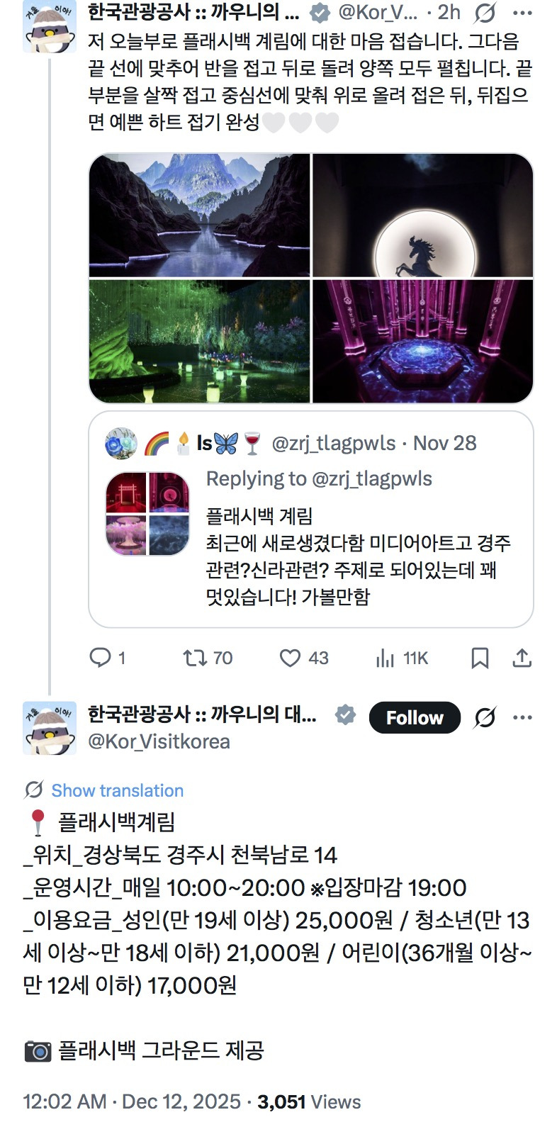 [흥미돋]경주에 새로 생긴 경주랑 신라를 주제로 한 미디어아트 작성자Sunmoonstar02|작성시간25.12.12|조회수19,226 목록 댓글 14 글자크기 작게가 글자크기 크게가 출처: https://x.com/Kor_Visitkorea/status/1999389417803514030?s=20 다음검색 현재 게시글 추가 기능 열기 북마크 공유하기 신고 센터로 신고 댓글 댓글 14 댓글쓰기 답글쓰기 댓글 리스트 작성자맑은별 | 작성시간 25.12.12 미디어아트 넘 좋아하는데 가보고싶다 작성자XOXZ | 작성시간 25.12.12 와 넘 궁금하다ㅠㅠ 작성자ISTJ입니다 | 작성시간 25.12.12 하쒸 지난달에 갔었는데!! 작성자킹용가리치킨 | 작성시간 25.12.12 미친 나 저번주에 댕겨왓는데.ᐟ.ᐟ.ᐟ.ᐟ.ᐟ.ᐟ.ᐟ.ᐟ.ᐟ 쩔수없지 또 가야겟다~~ 작성자라로리로 | 작성시간 25.12.13 믜친 경주 갈 이유 ~~~ 댓글 전체보기