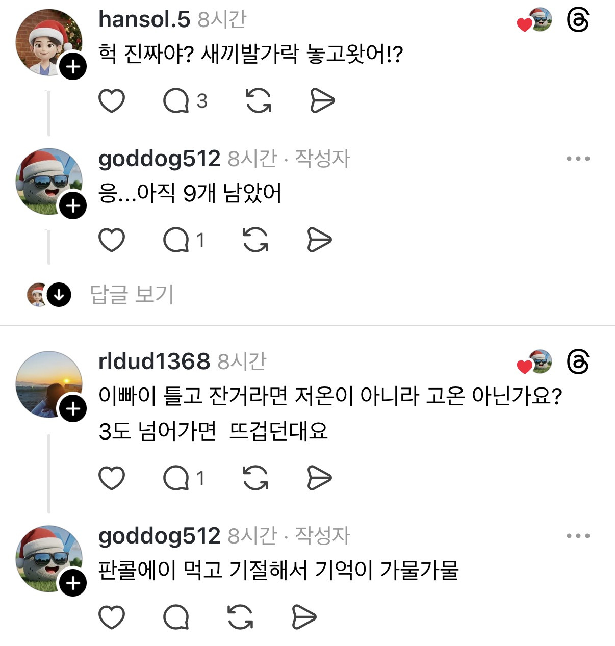 작성자뚀 니 살 작성시간 25.12.13 좀 춥게 자야 건강이랑 수면의 질에도 좋댔음