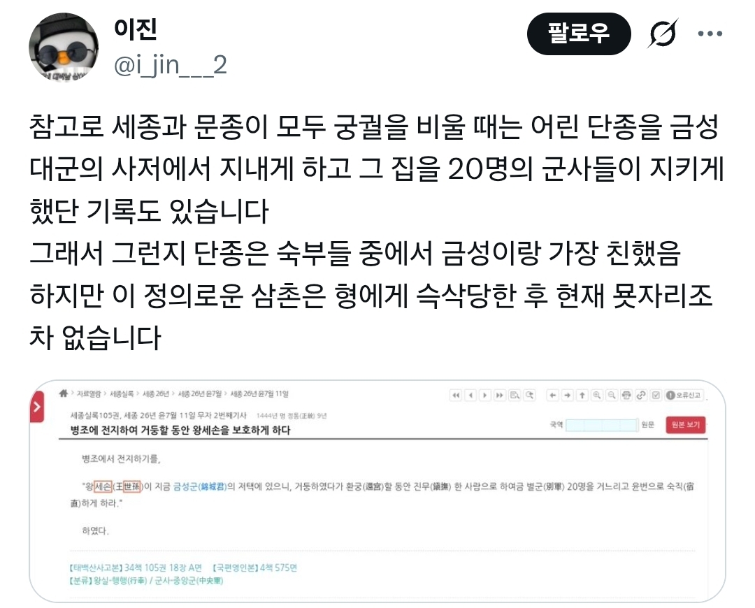 [흥미돋]영화 "왕과 사는 남자"에서 삼촌-조카로 나오는 박지훈과 이준혁(ㅅㅍ) 작성자uvkbis|작성시간25.12.12|조회수44,462 목록 댓글 33 글자크기 작게가 글자크기 크게가 출처: https://x.com/dejh_may29/status/1999267452719681774?s=20단종과 금성대군(이준혁은 다른 영화 사진인듯) 다음검색 현재 게시글 추가 기능 열기 북마크 공유하기 신고 센터로 신고 댓글 댓글 33 댓글쓰기 답글쓰기 댓글 리스트 작성자이재명각하^^7 | 작성시간 25.12.13 수양은 지옥에서 개비에게 아직도 쳐 맞고 있을 듯 작성자우리 옆집 한남 존나 시끄러워 | 작성시간 25.12.13 아니 묫자리도 없다고??? 수양대군 미친놈 작성자이지외단 | 작성시간 25.12.13 저 영화에 수양대군 누군지 제일 궁금 안 나오나? 아 또 리뷰쓰러간다 작성자열무비빔면 | 작성시간 25.12.13 근데 수양대군은 아직도 안풀렸네 궁금하다 작성자주우제 | 작성시간 25.12.13 폐기물급세조 댓글 전체보기