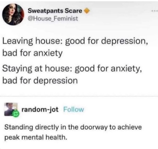 외출하면: 우울증에는 좋지만 불안장애에는 안 좋음 집에 있으면: 불안장애에는 좋지만 우울증엔 안 좋음