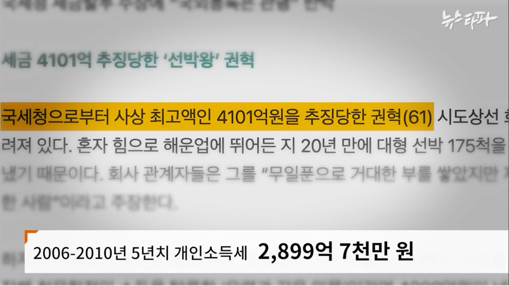 권 회장은 14년째 세금을 내지 않고 있으며 체납액은 3938억원에 이른다. 법인 최고액 체납자 역시 권 회장의 제2차 납세의무자인 시도탱커홀딩(1537억원)과 시도홀딩(1534억원)으로, 각각 1·2위를 차지했다.