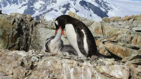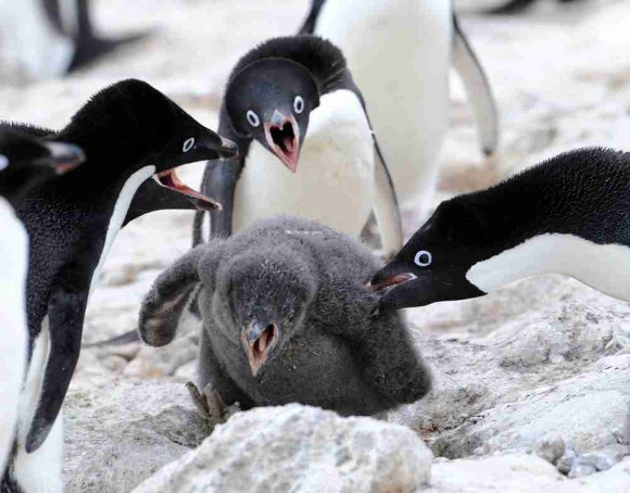 아델리 펭귄은 영역을 정하면서 약한 황제펭귄 새끼들을