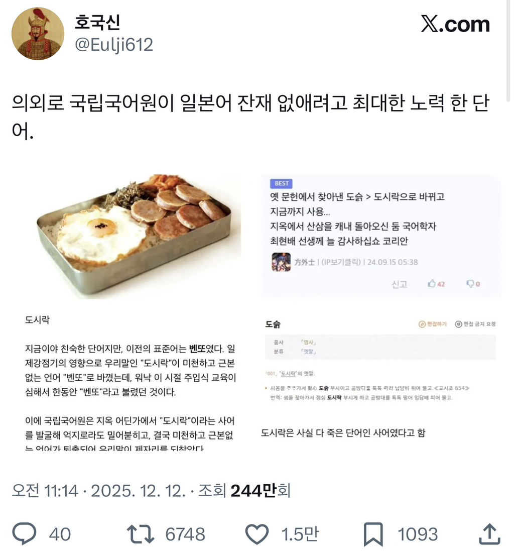 [흥미돋]의외로 국립국어원이 일본어 잔재 없애려고 최대한 노력 한 단어 작성자귀찮지만|작성시간25.12.13|조회수15,227 목록 댓글 33 글자크기 작게가 글자크기 크게가 출처: https://x.com/eulji612/status/1999301857861406743 다음검색 현재 게시글 추가 기능 열기 북마크 공유하기 신고 센터로 신고 댓글 댓글 33 댓글쓰기 답글쓰기 댓글 리스트 작성자대통령의 스크린타임을 보장하라 | 작성시간 25.12.13 작성자지구야아프지마 | 작성시간 25.12.13 도슭도슭♡ 작성자닭볶음1탕 | 작성시간 25.12.13 도시락>이름만들어도 소풍가는 기분이고 군침돌음벤또>좃본 특유 달고 짠 음식만 있을거 같음 답댓글 작성자그냥웃겨요 | 작성시간 25.12.13 ㅋㅋㅋㅋㅋㅋㅋㅋㅋㅋ 아 웃겨 ㄹㅇ임 작성자버거킹 지박령 | 작성시간 25.12.13 너무 좋아 도시락도시락 일본어 다 바꿔버려 이상한 일본어 자꾸 들여오지말고~~~~!!! 댓글 전체보기