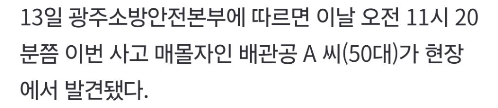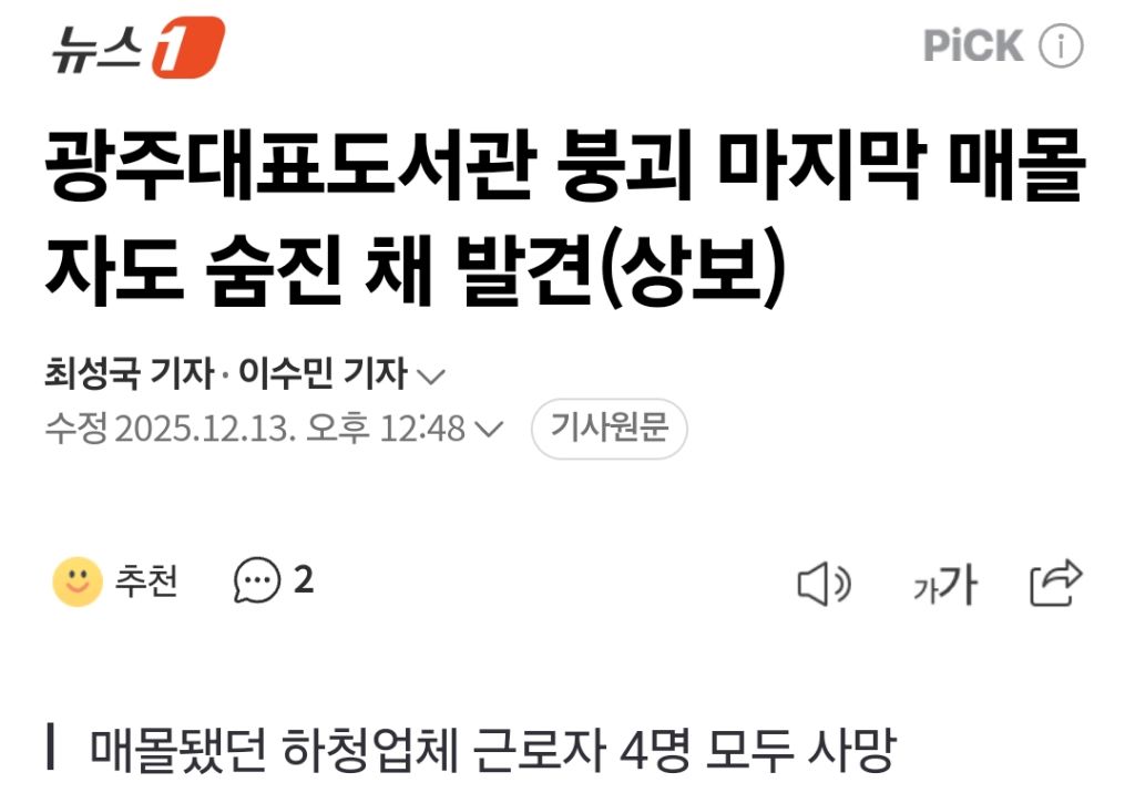 [여시뉴스데스크]광주대표도서관 붕괴 마지막 매몰자도 숨진 채 발견(상보) 작성자어묵의계절|작성시간25.12.13|조회수22,945 목록 댓글 71 글자크기 작게가 글자크기 크게가 출처: https://naver.me/xktkHwjn광주대표도서관 붕괴 마지막 매몰자도 숨진 채 발견(상보)최성국 이수민 기자 = 광주대표도서관 붕괴 사고로 매몰됐던 근로자 4명 중 실종됐던 마지막 1명이 숨진 채 발견됐다. 13일 광주소방안전본부에 따르면 이날 오전 11시 20분쯤 이번 사고 매몰자인 n.news.naver.com내용 있는 상보로 가져옴삼가 고인의 명복을 빕니다 다음검색 현재 게시글 추가 기능 열기 북마크 공유하기 신고 센터로 신고 댓글 댓글 71 댓글쓰기 답글쓰기 댓글 리스트 작성자클래식뱅쇼 | 작성시간 25.12.13 삼가 고인의 명복을 빕니다 작성자그저 여명일 뿐 | 작성시간 25.12.13 편안히 쉬시길 바랍니다. 작성자나는야낭만먹보 | 작성시간 25.12.13 삼가 고인의 명복을 빕니다 작성자공성직이 | 작성시간 25.12.13 삼가 고인의 명복을 빕니다 작성자애매한모임 | 작성시간 25.12.13 삼가 고인의 명복을 빕니다 댓글 전체보기