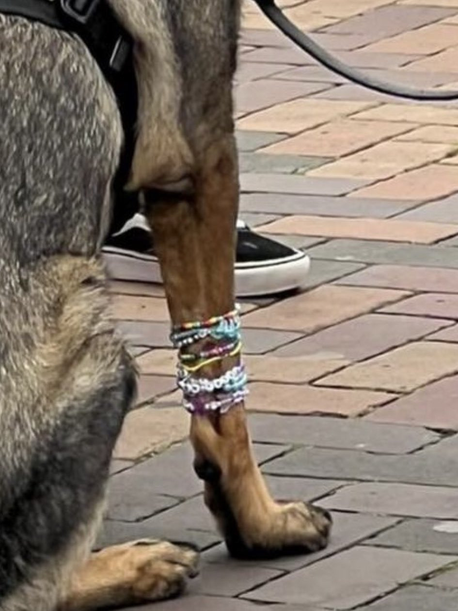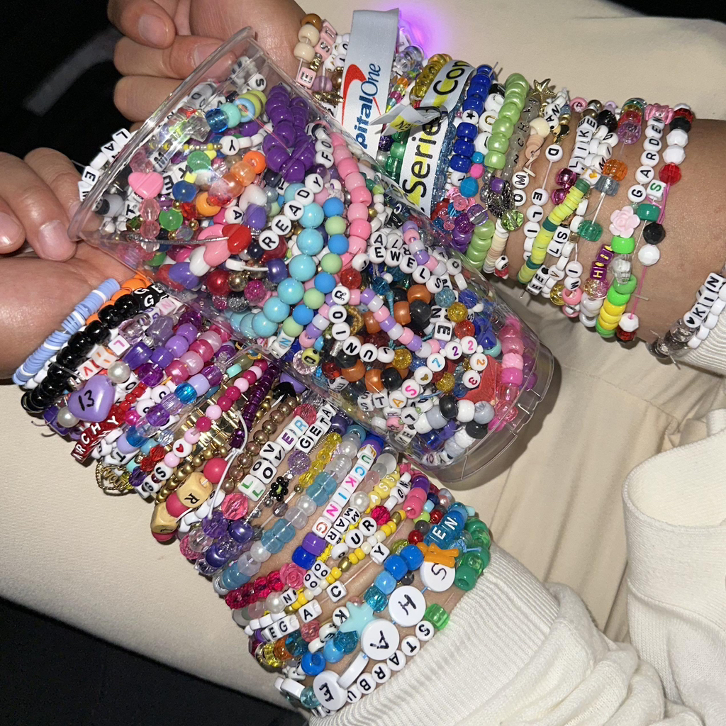 만들어간 팔찌 서로 교환하는 게 문화라 한두개만 차는 게 아니라 거의 깁스 수준으로 몇십개씩 차고 있음