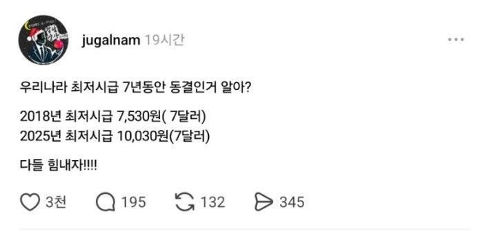[흥미돋]우리나라 최저시급 7년동안 동결 상태인거 알아? 작성자자자자장|작성시간25.12.13|조회수10,359 목록 댓글 24 글자크기 작게가 글자크기 크게가 출처: 트위터 jugalnam웃프다.. 다음검색 현재 게시글 추가 기능 열기 북마크 공유하기 신고 센터로 신고 댓글 댓글 24 댓글쓰기 답글쓰기 댓글 리스트 작성자담배피우는 호랑이 | 작성시간 25.12.13 시발ㅋㅋ 작성자에라모르겠다ㅠ | 작성시간 25.12.13 헐…. 작성자nbejjanmsf jdnfgw | 작성시간 25.12.13 어이없어 오늘 핑계고 생각나네 작성자마라썅구리 | 작성시간 25.12.14 열받네 작성자해있는날이좋아 | 작성시간 25.12.14 헐... 댓글 전체보기