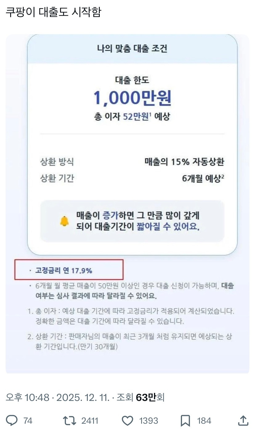 [흥미돋]쿠팡이 대출도 시작함 작성자돈테크만|작성시간25.12.13|조회수43,038 목록 댓글 70 글자크기 작게가 글자크기 크게가 출처: https://x.com/jongy064/status/1999114000483909969?s=46 여성시대 돈테크만판매자 대상…17.9% 다음검색 현재 게시글 추가 기능 열기 북마크 공유하기 신고 센터로 신고 댓글 댓글 70 댓글쓰기 답글쓰기 댓글 리스트 작성자레몬라임앤비터스 | 작성시간 25.12.14 아니 외국엔 저딴 기업이 흔해? 작성자로투스도넛 | 작성시간 25.12.14 ㅁㅊ 작성자안녕자두야안녕 | 작성시간 25.12.14 ㅁㅊ 작성자다이노탱! | 작성시간 25.12.14 쟤네가 금융업도 해? 이제 은산분리 안시키나 작성자lateCheckout | 작성시간 25.12.14 이자 쳐도른 미친새끼가 무슨팡 규제좀해 시발 댓글 전체보기