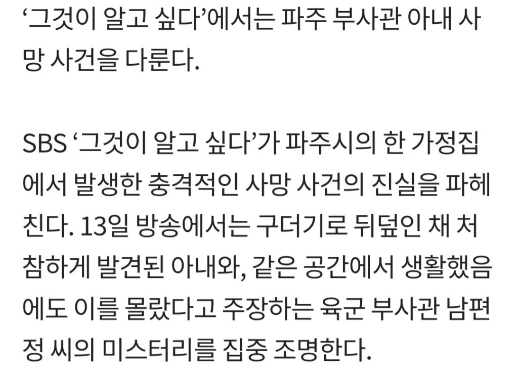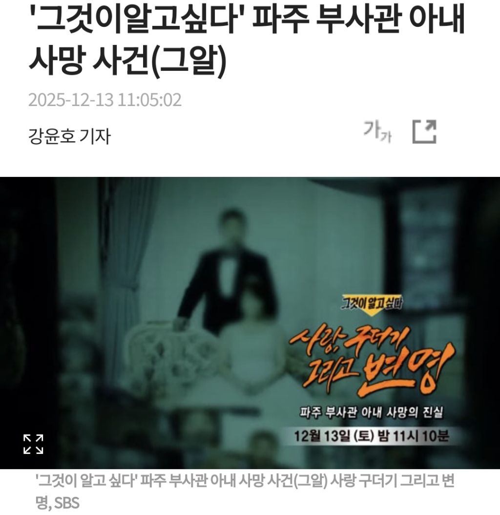 [여시뉴스데스크]'그것이알고싶다' 파주 부사관 아내 사망 사건(그알) 작성자슈퍼홍길동|작성시간25.12.13|조회수44,463 목록 댓글 31 글자크기 작게가 글자크기 크게가 출처: https://www.bntnews.co.kr/article/view/bnt202512120205 다음검색 현재 게시글 추가 기능 열기 북마크 공유하기 신고 센터로 신고 댓글 댓글 31 댓글쓰기 답글쓰기 댓글 리스트 작성자해바라기반 채성아선생님 | 작성시간 25.12.14 진짜 뭔짓을 한거야 작성자미란다오렌지맛 | 작성시간 25.12.14 너무 잔인해 하 진짜 작성자supernovaaoe | 작성시간 25.12.14 진짜오바아니냐? 작성자진시황의아사히베리 | 작성시간 25.12.14 물 40톤은 왜쓴거야 작성자나는야 뚜벅초 | 작성시간 25.12.15 대서특필해라 이게 21세기에 일어난 범죄라고? 댓글 전체보기