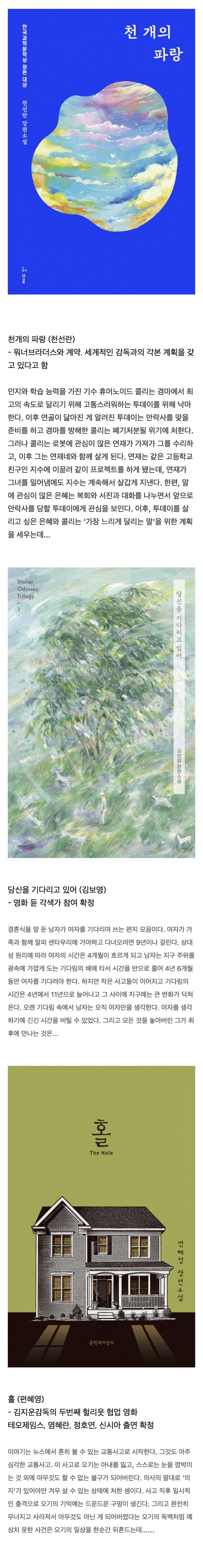 작성자시보야 작성시간 25.12.14 당신을 기다리고 있어 진짜 재밌게 읽음 영화화 될 것 같았는데 할리우드라니!!! 홀은 어떤 식으로 나올지 궁금해