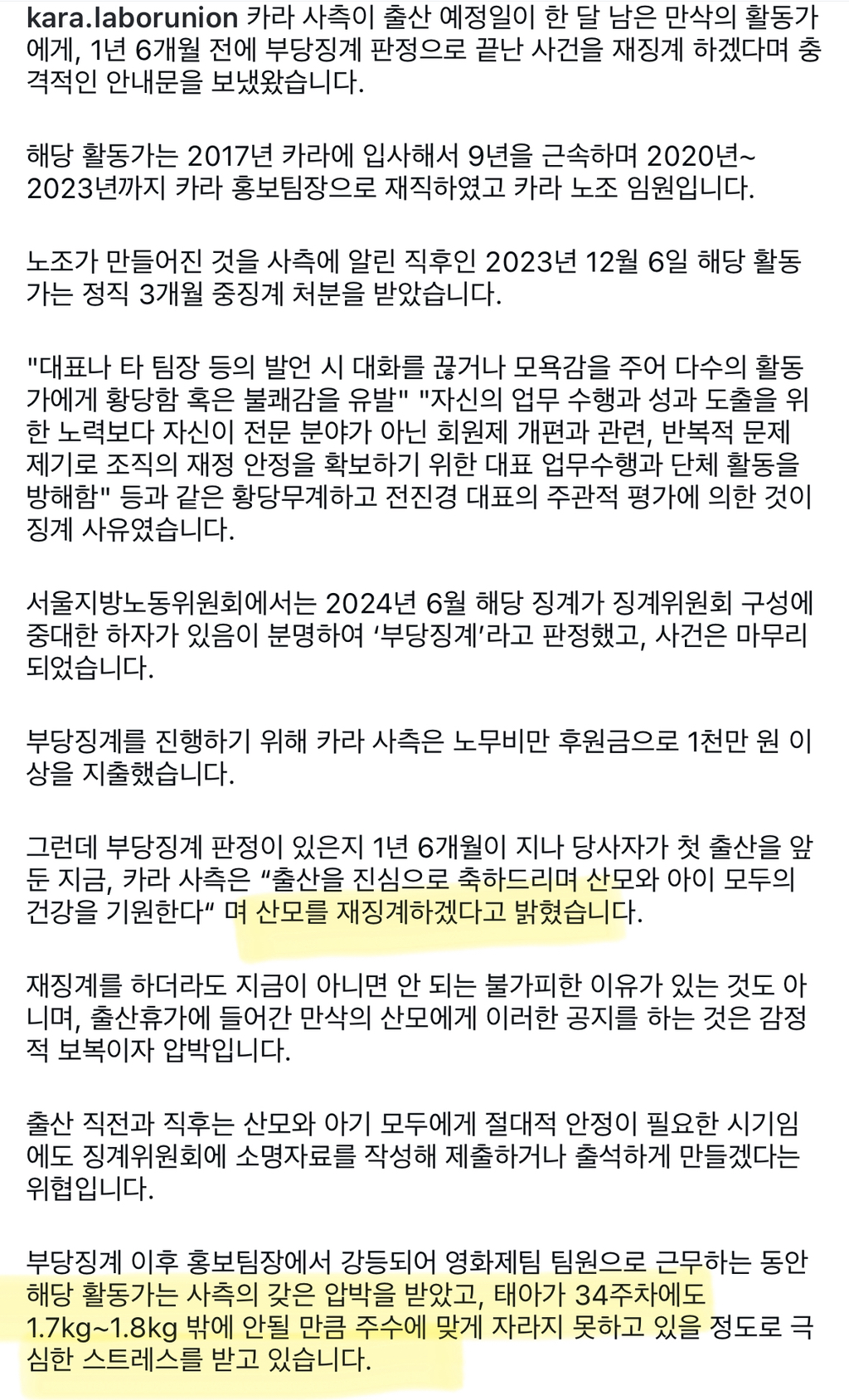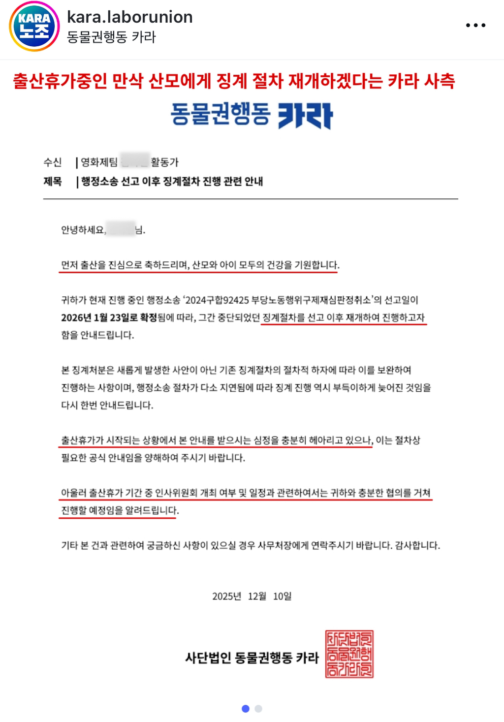 출산휴가 중인 만삭 산모에게 부당징계 판정 이미 받은 징계를 다시 하겠다고 공문을 보냈대…