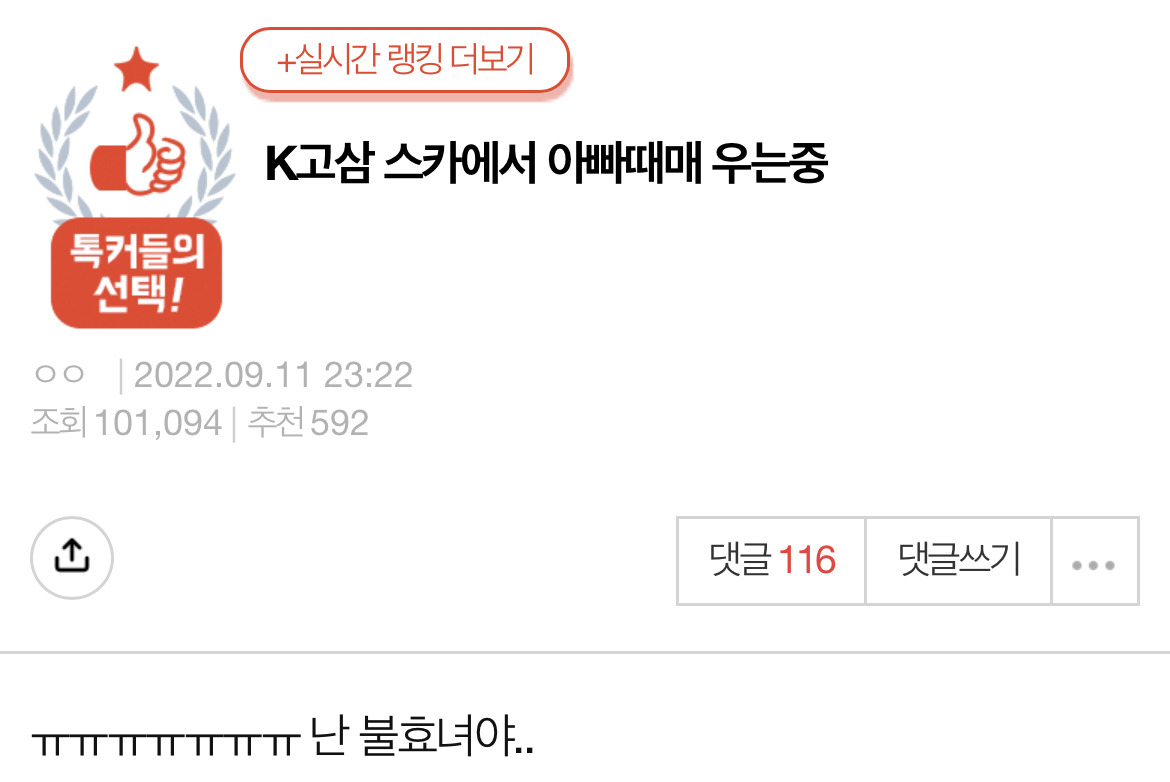 [흥미돋]k고삼 스카에서 아빠때문에 우는중 작성자흥미돋|작성시간25.12.14|조회수37,091 목록 댓글 15 글자크기 작게가 글자크기 크게가 출처: https://cafe.daum.net/subdued20club/ReHf/5108726K고삼 스카에서 아빠때매 우는중출처 : 여성시대 (어잉격)https://pann.nate.com/talk/367566906K고삼 스카에서 아빠때매 우는중ㅠㅠㅠㅠㅠㅠㅠ 난 불효녀야..pann.nate.comcafe.daum.net 다음검색 현재 게시글 추가 기능 열기 북마크 공유하기 신고 센터로 신고 댓글 댓글 15 댓글쓰기 답글쓰기 댓글 리스트 작성자진짜귀엽다 | 작성시간 25.12.14 감동 작성자오마위아래 | 작성시간 25.12.14 부럽다 저런아빠있어서 작성자vbjkk | 작성시간 25.12.14 부럽.. 작성자뿅뿅해 | 작성시간 25.12.14 부럽다 ㅠ 작성자뜯뜯이 | 작성시간 25.12.14 여행 성공 ㅠㅠㅠㅠ 댓글 전체보기
