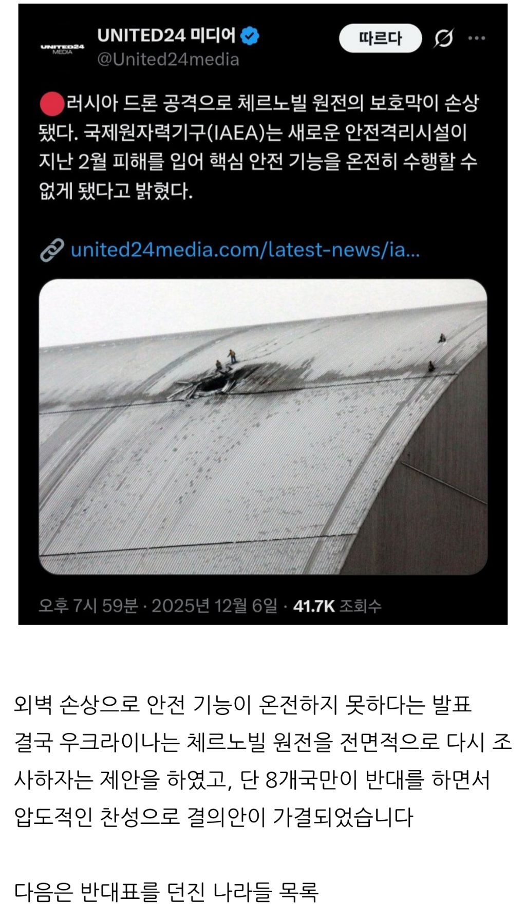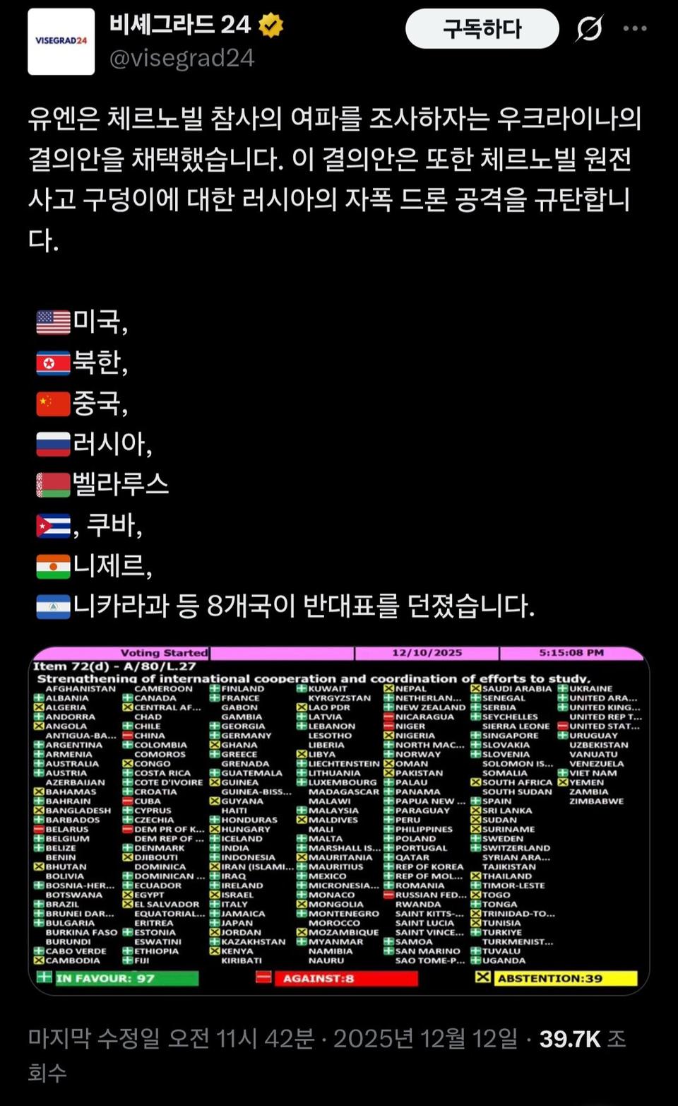 [기타]공습당한 체르노빌 원전 전면 재조사 반대 국가 목록.jpg 작성자아흐레|작성시간25.12.14|조회수12,894 목록 댓글 9 글자크기 작게가 글자크기 크게가 출처: https://theqoo.net/square/4027362045미국 너네 뭐하냐? 다음검색 현재 게시글 추가 기능 열기 북마크 공유하기 신고 센터로 신고 댓글 댓글 9 댓글쓰기 답글쓰기 댓글 리스트 작성자힘내 | 작성시간 25.12.14 라인업에 미국뭐냐 ㅋㅋㅋㅋ 작성자오뚜기 마요 | 작성시간 25.12.14 저래놓고 세계의 경찰이랜다 ㅅㅂㅋㅋㅋ 작성자MZ세대프로이직러 | 작성시간 25.12.14 미국 뭐임? 작성자헤어나와야 | 작성시간 25.12.14 의외로 일본이 반대표던질울알았는데 미국뭐더냐 느그뭐해 작성자삼라도 | 작성시간 25.12.14 미국뭐해;;; 댓글 전체보기