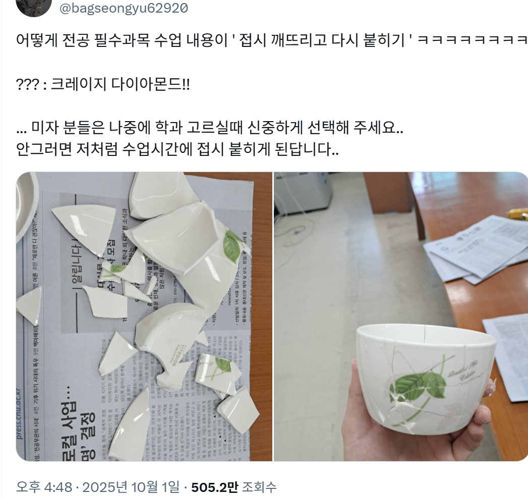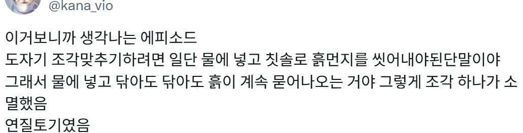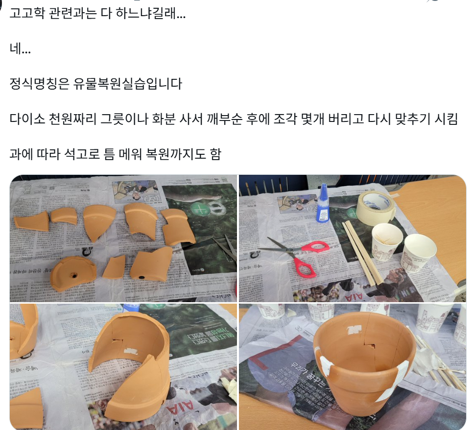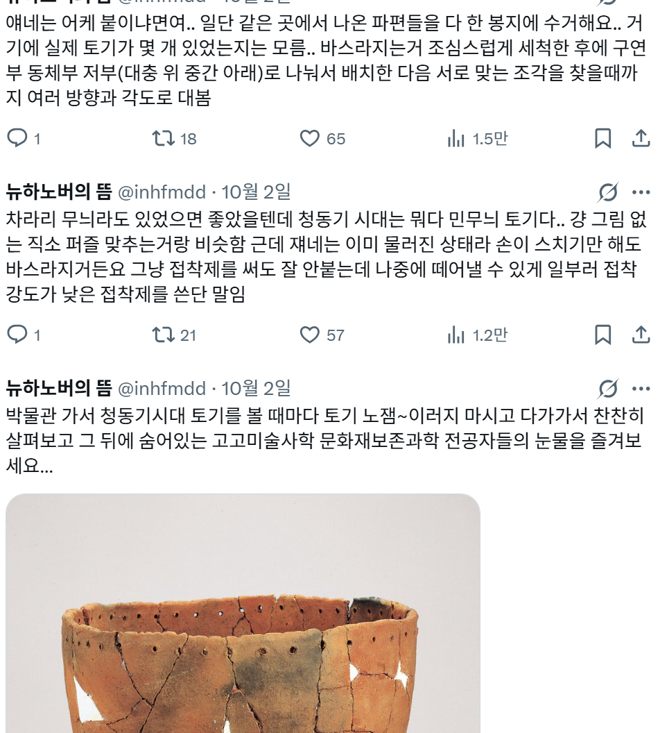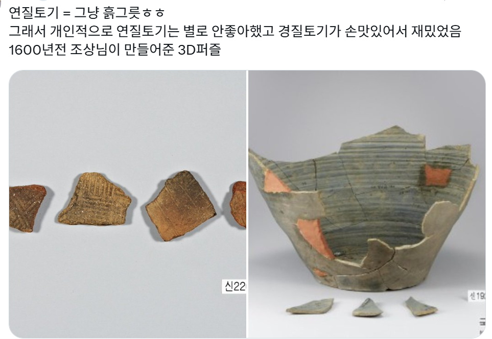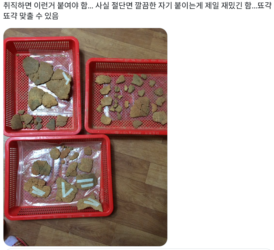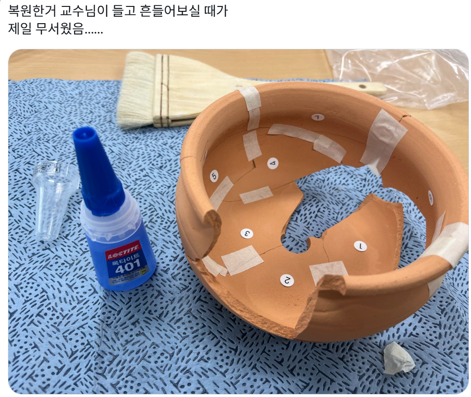 아 토기 복원하는거ㅠ 실수로 잘못 붙여놨을땐 손발줄줄되서 아세톤인가에 담궈놨던거 생각난다 -